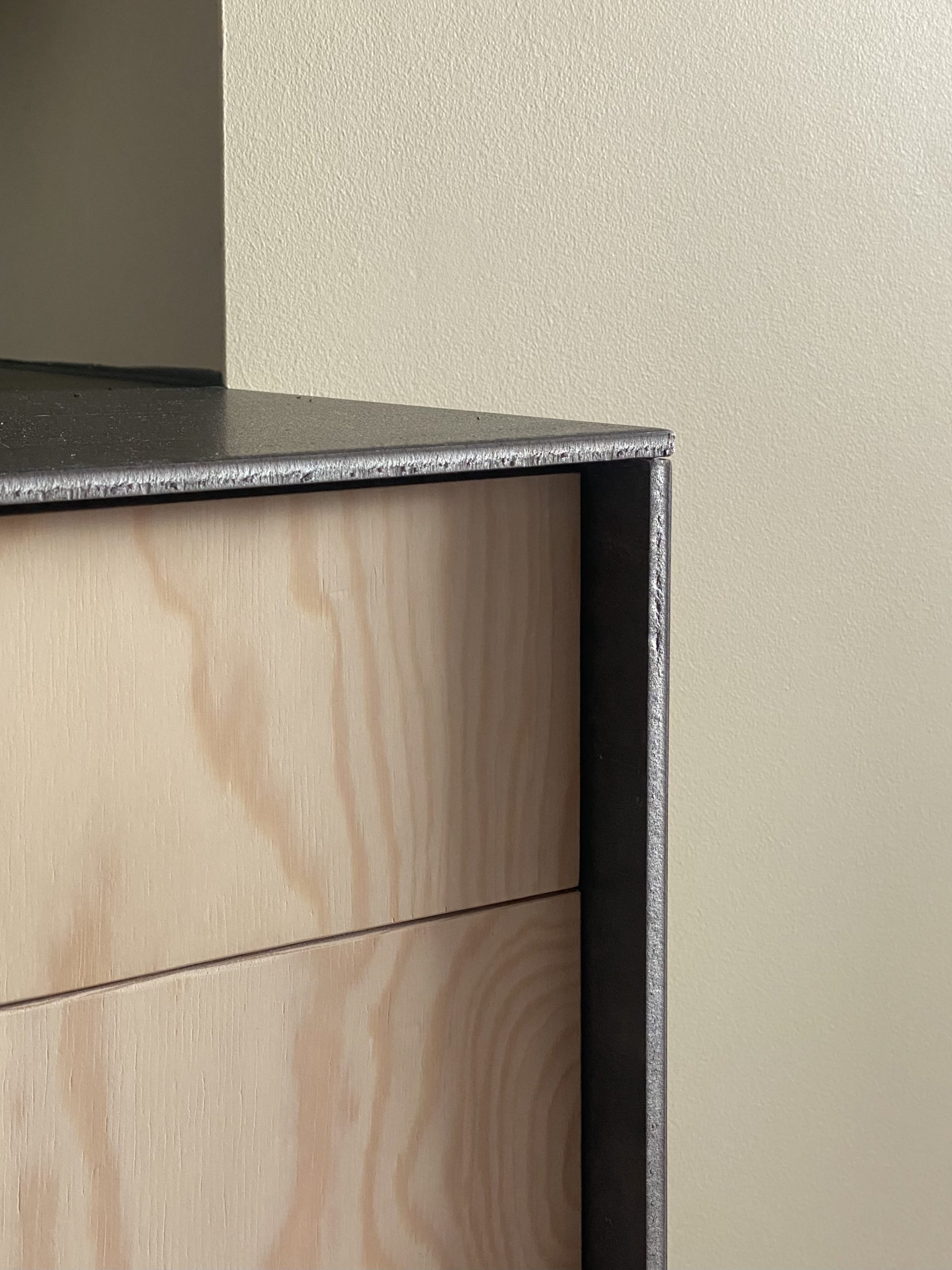 - Stålplate fra veggkjerne i et avlyttingsfritt rom har blitt til benkeplate og backsplash. Foto: IARK