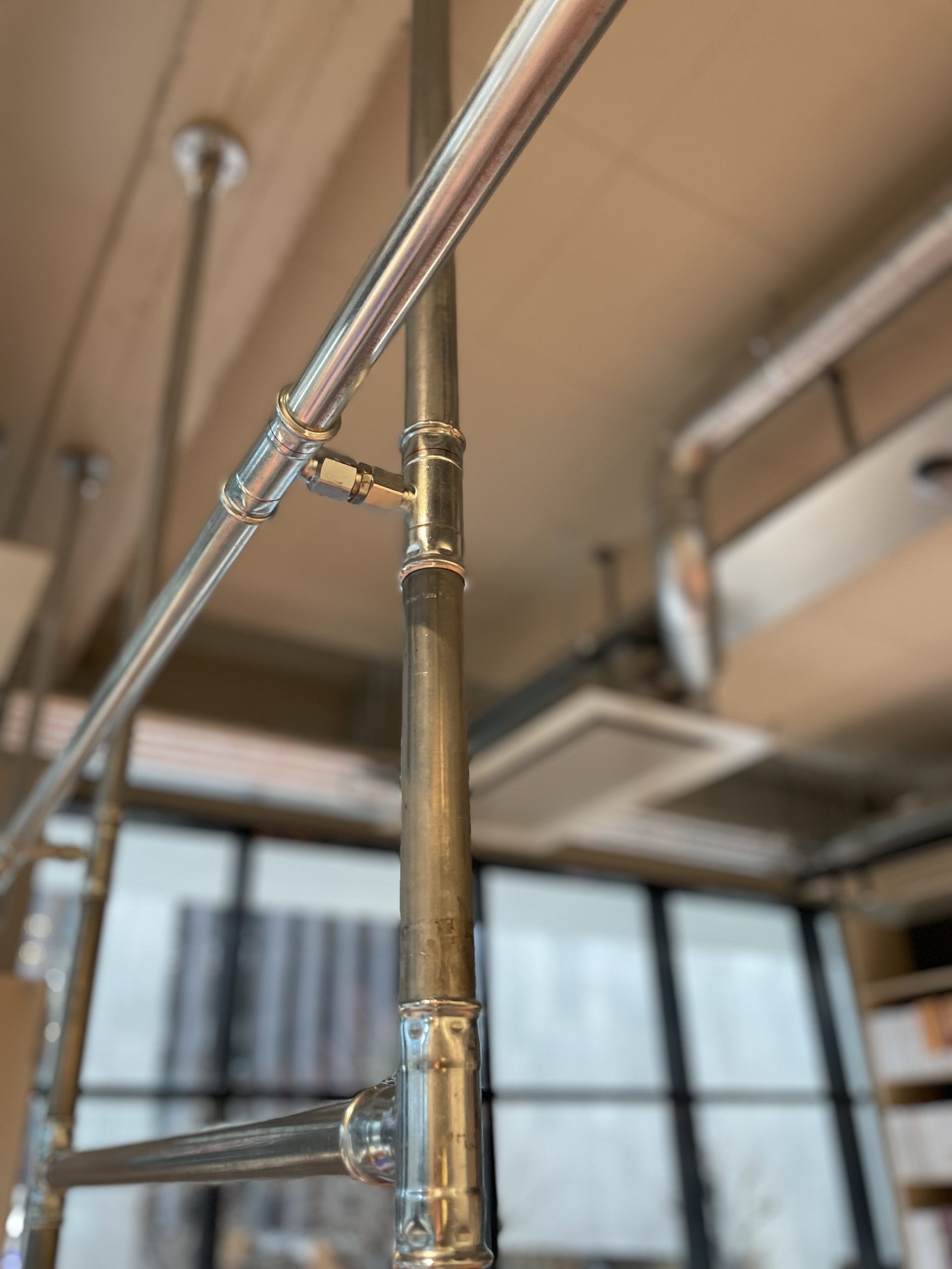 - Gjenbrukt røropplegg brukes i dag til oppheng av tekstilprøver i lokalene til IARK. Foto: IARK