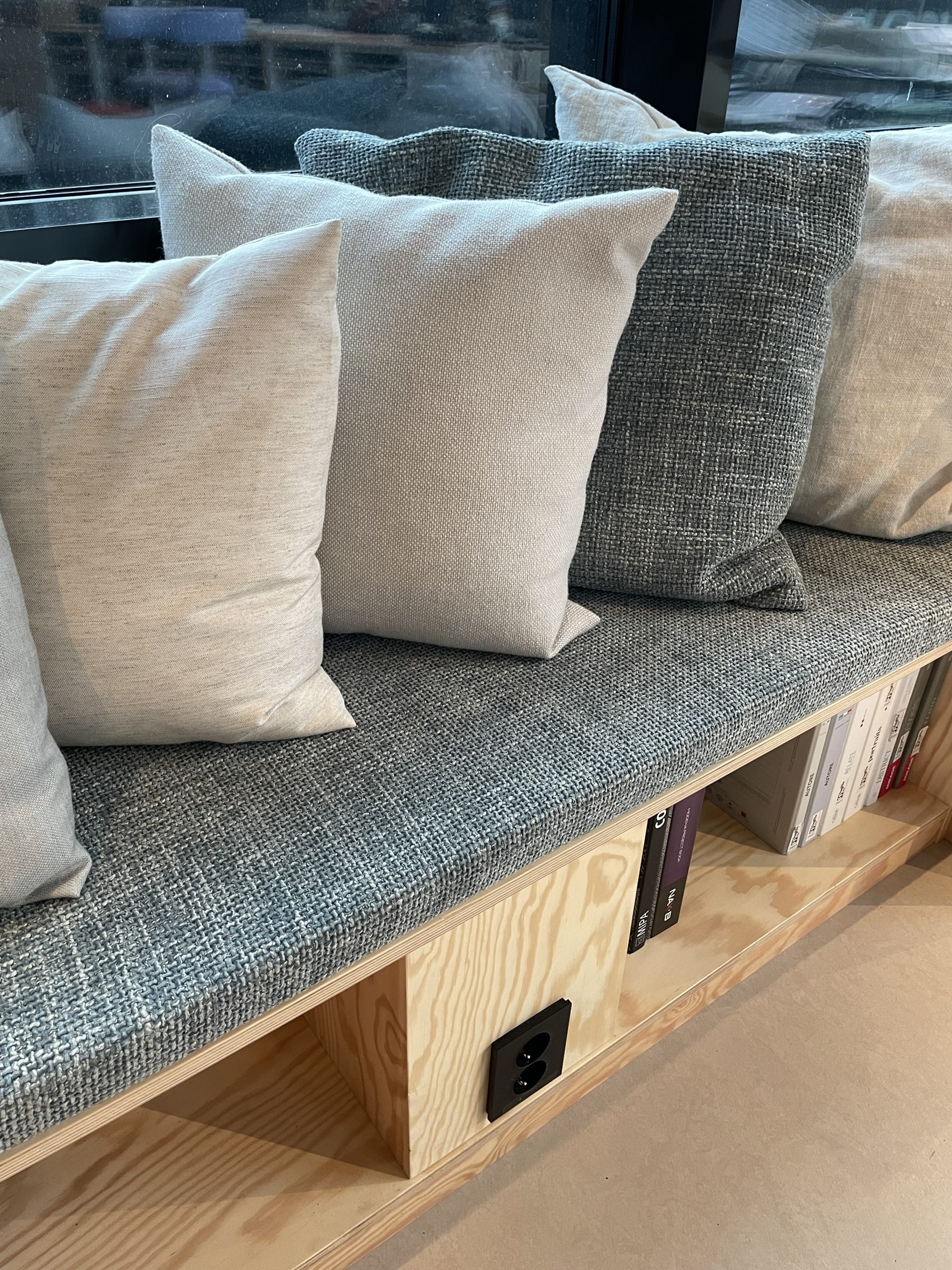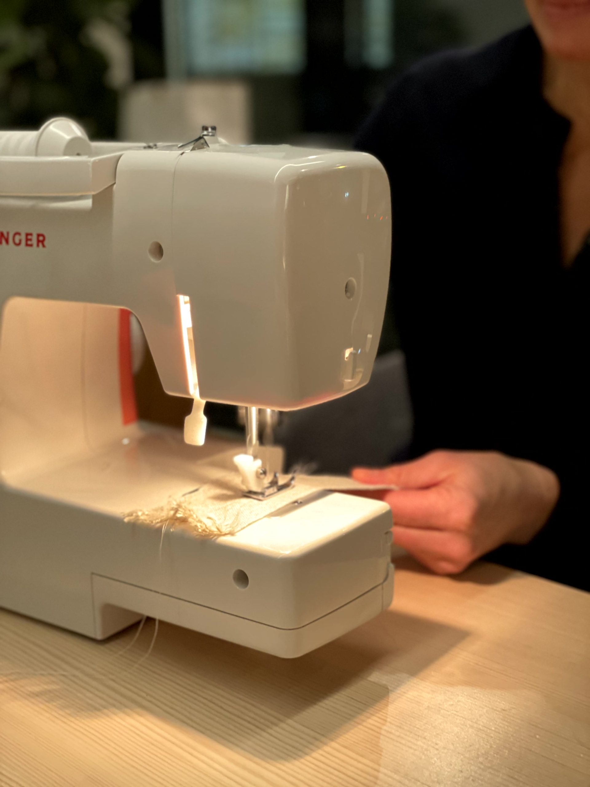 - Donert tekstil blir til puter i en lun sittekrok etter litt ekte dugnadsånd bak symaskinen. Foto: IARK