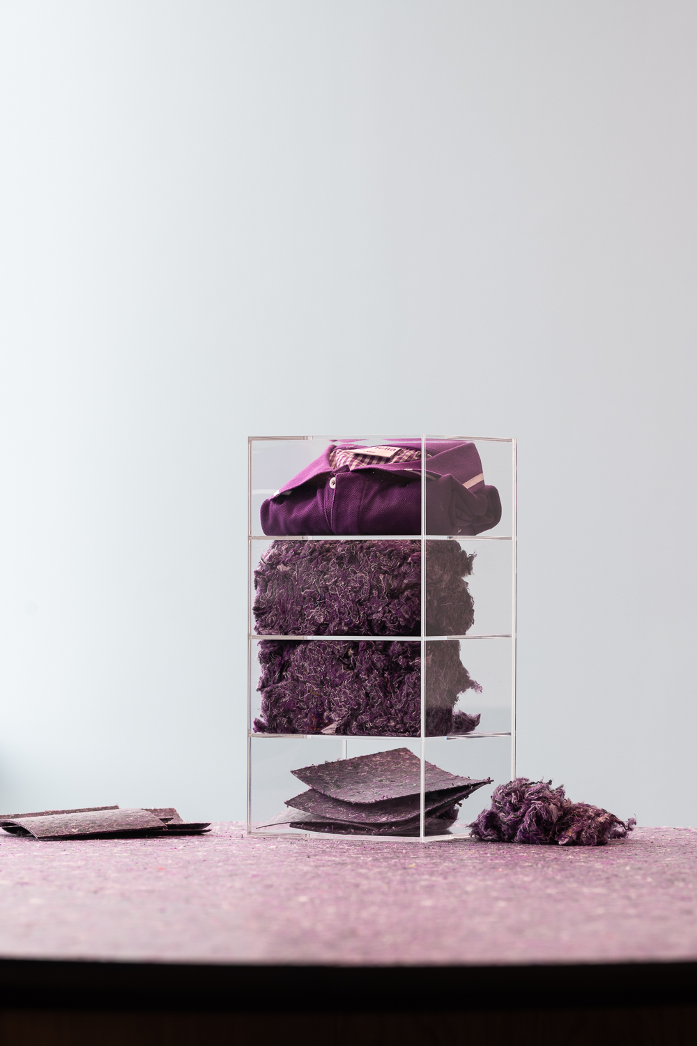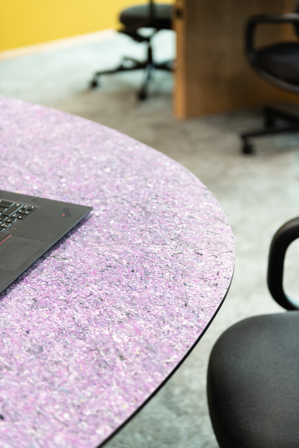 - Bordplater laget av innsamlet tøy hos Telia. Foto: Niklas Hart
