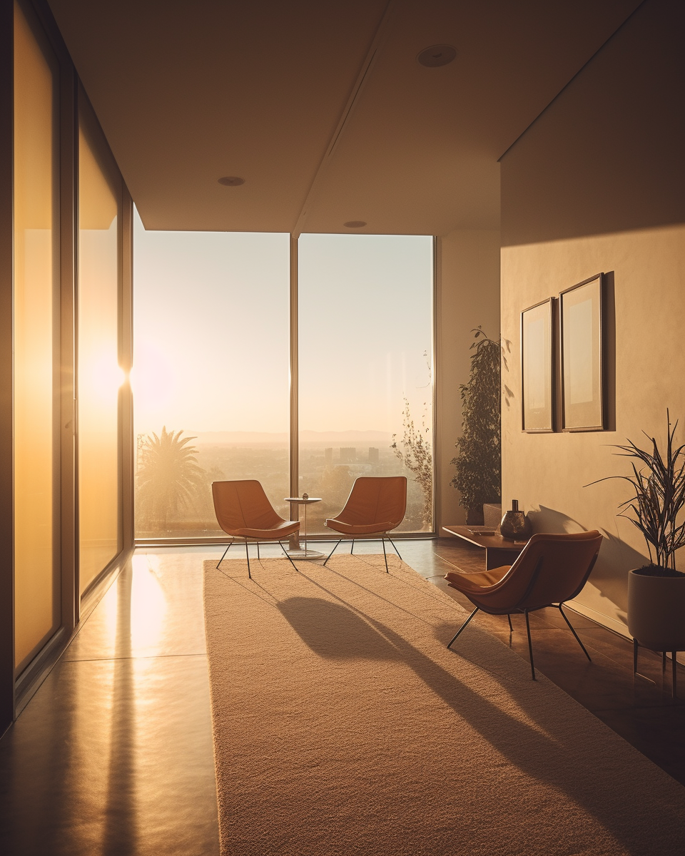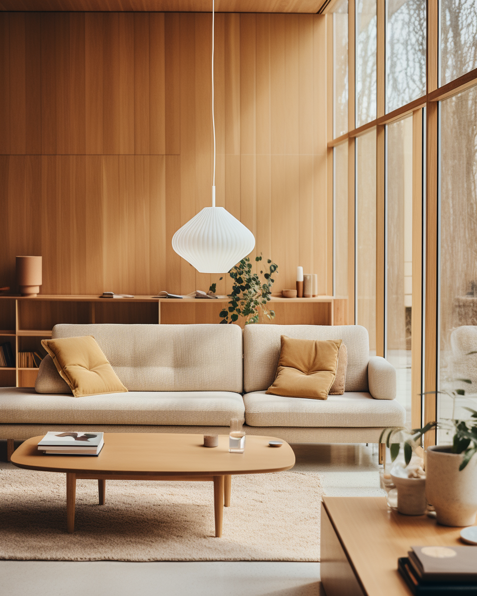 Interior architectural editorial shoot of natural looking scandinavian living room, Muuto furniture, Artek furniture, Alvar Aalto, modern styling, 2020´s style, Monocle Magazine, colorful, kodakchrome color photograph, wool fabrics, oak wood, cinematic style, hyper realistic, Oslo, dusty, cloudy, windy, golden hour light, Hard direct movie fresnell light, center composition, shot with a Canon EOS D5 Canon 50mm USM 1.2 f1.2, Julius Schulman –ar 4:5 –v 5 –q 2