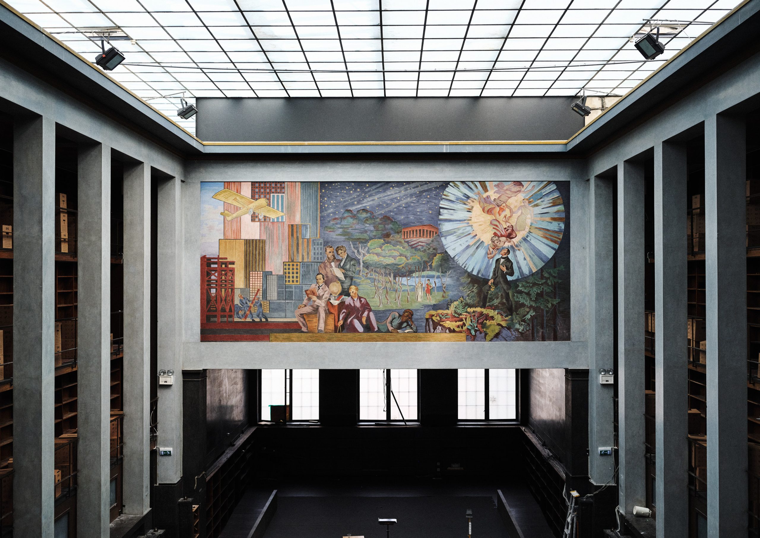 - Fresken «Teknikk, Vitenskap, Diktning» i hovedsalen er malt av Axel Revold (1887-1962) og vil skinne på nytt når bygget gjenåpner i 2027.