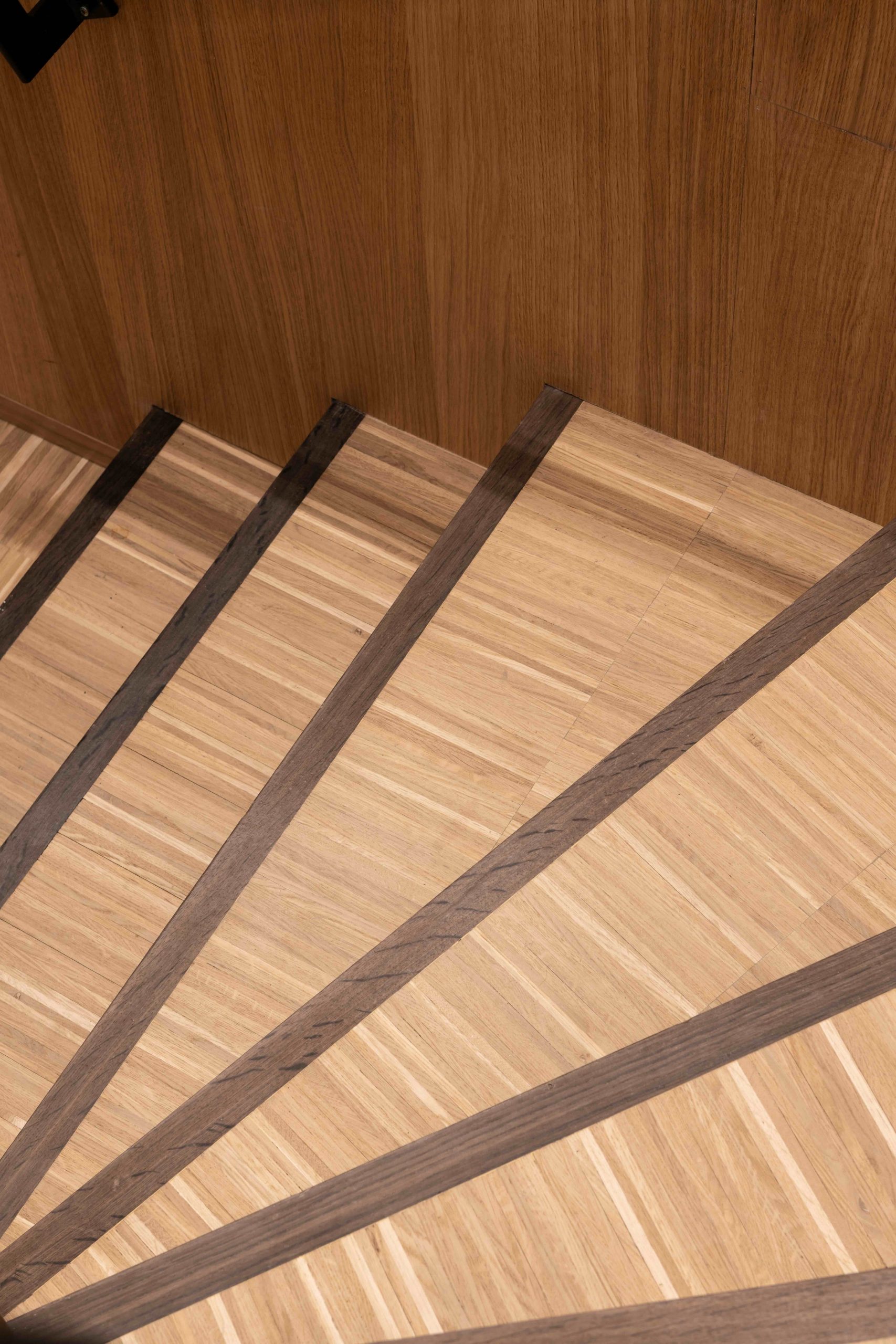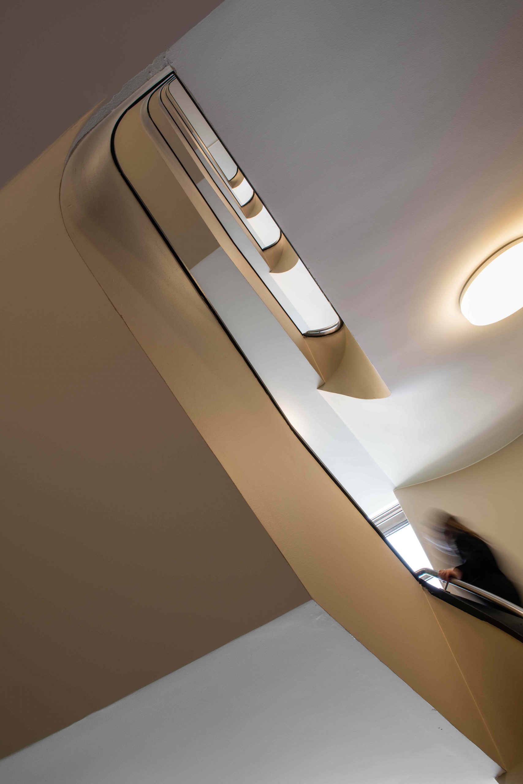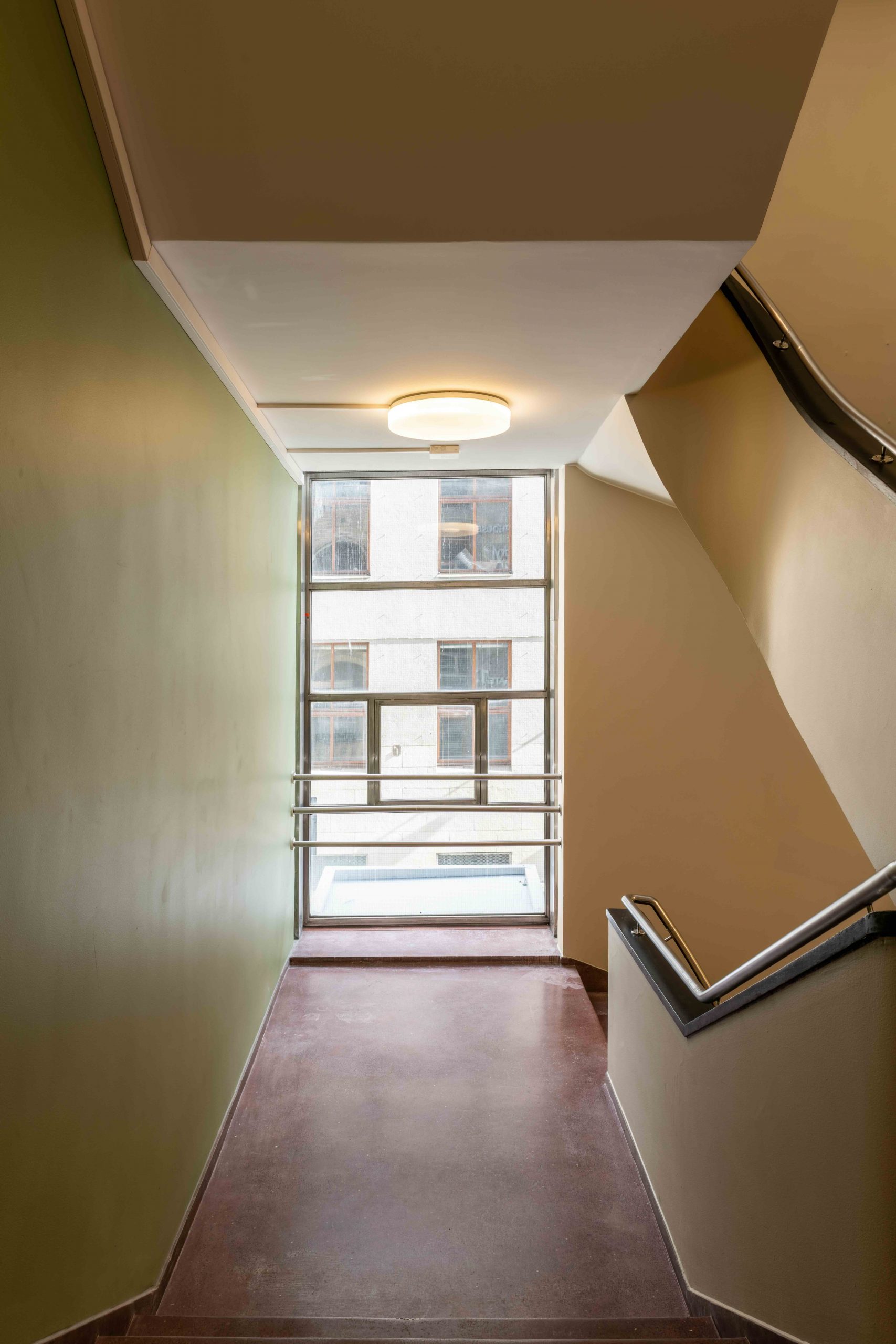 - Restaurert trapperom i Øvre Vollgate 13 hvor originale farger og materialer er bevart. Her ser vi hvordan en håndløper får kontrast ved et mørkere felt under. Dette gir en kvalitet til hele trappeløpet. Foto: Niklas Hart