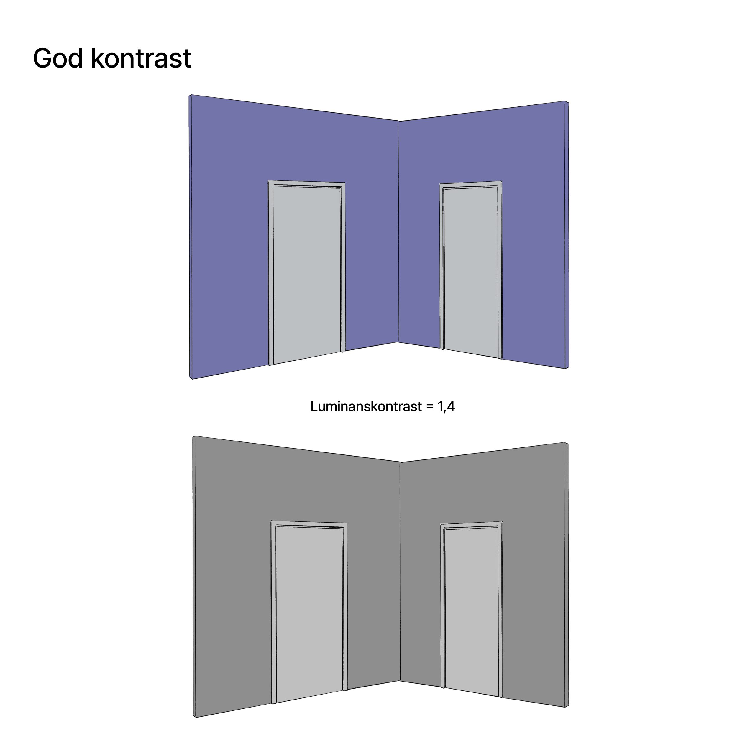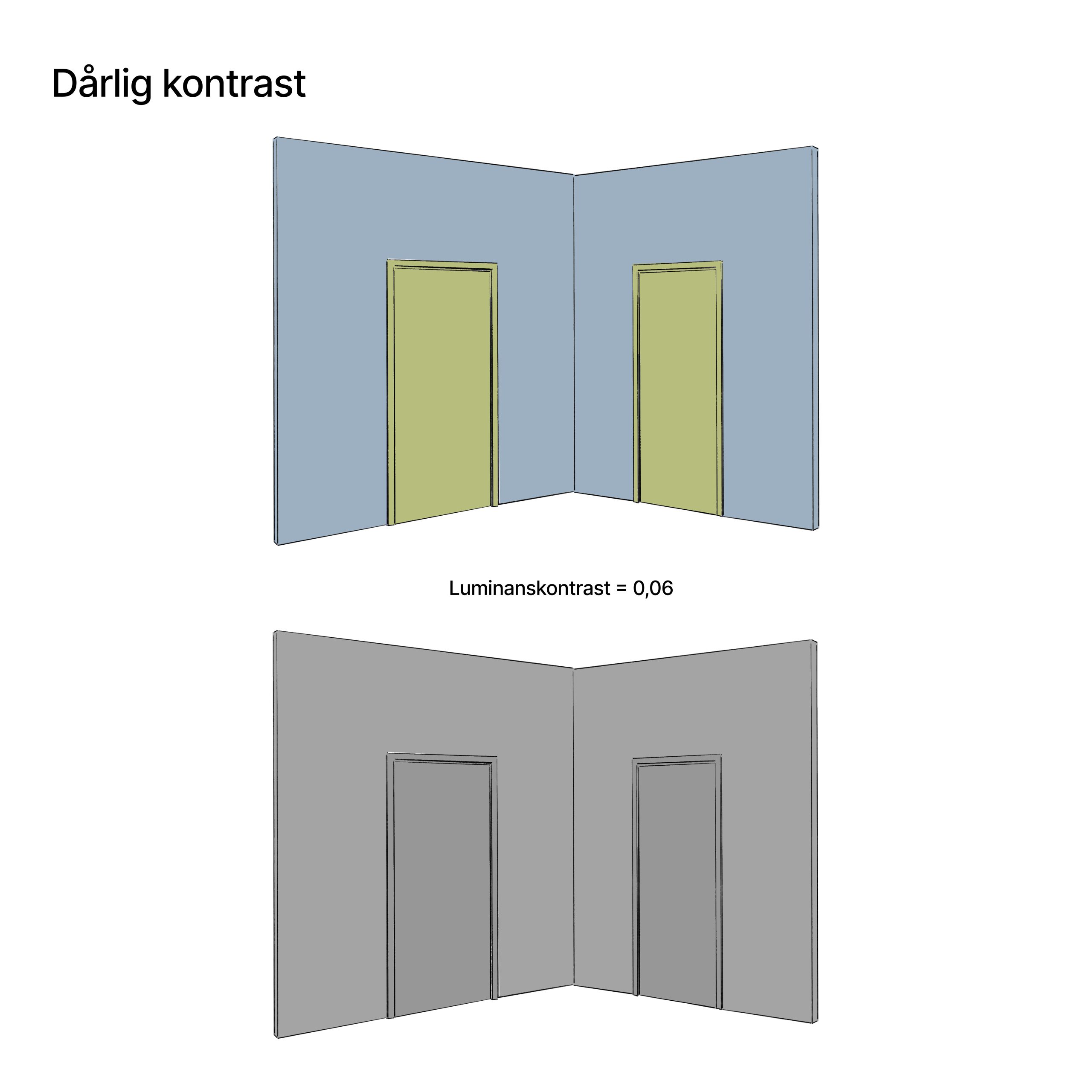 To ulike farger kan for synsfriske være virkningsfullt i seg selv, men nyansene i kontraster kan fortsatt være vanskelig for mange med synsnedsettelser å oppfatte. Svekket analysering av omgivelsene skjer når mottakere eller avlesere i øyet ikke fungerer optimalt. Det er her luminanskontrast kommer inn. Et begrep som ofte kan være vanskelig for en synsfrisk å forstå, siden de oppfatter omgivelsene med et helt annet utgangspunkt. Luminanskontrasten til to overflater kan måles i hvor mye lyset reflekteres tilbake fra en farge opp mot en annen. To farger som sender tilbake lik mengde lys har dårlig kontrast til hverandre. Hvilke farger vi velger på dører og vegger har derfor stor betydning for rommets lesbarhet.