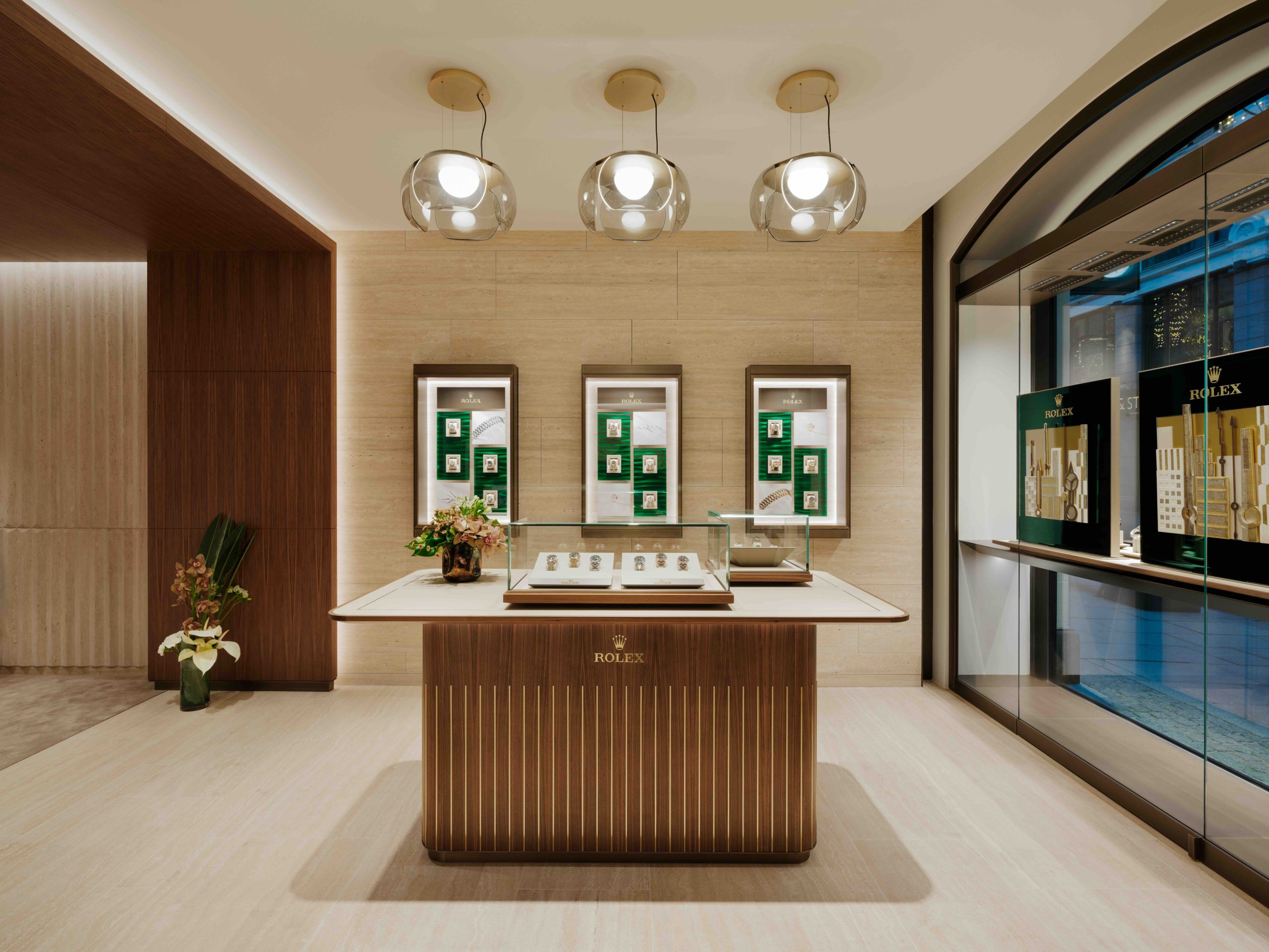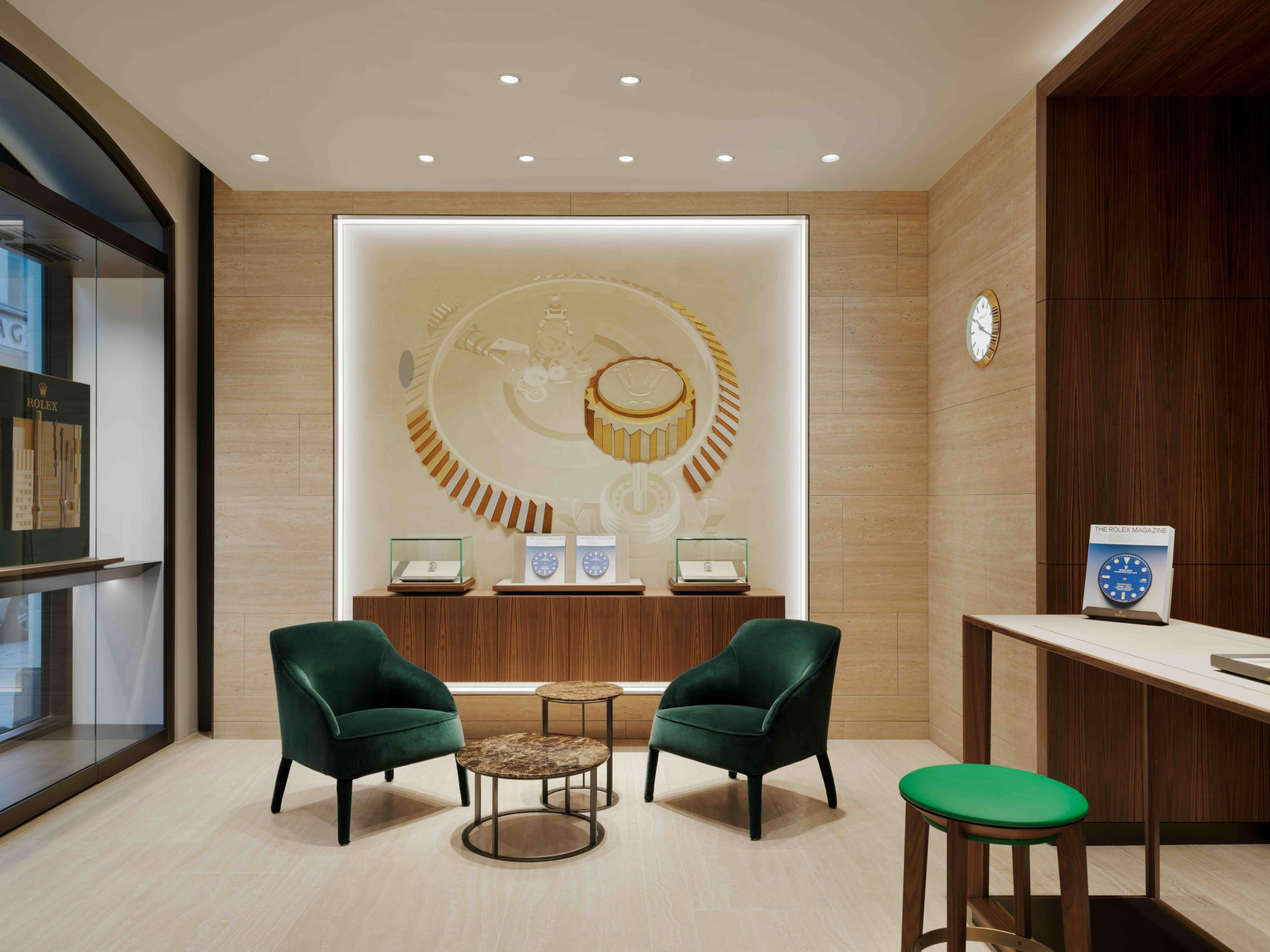 Interiøret, møblementet og dekorasjonen skal understreke Rolex’ kompromissløse krav til kvalitet på alle områder. Flere elementer knytter sammen estetikken til Rolex-klokkene og designet i den nye butikken: Rillemønsteret på bezelen til enkelte klokker i Classic-kolleksjonen har inspirert utformingen av stukkaturveggene. Den buede Cyclops-linsen gjenspeiles i formen på lampene som henger over utstillingsdisken i salgsområdet i første etasje, spesialdesignet av Rolex. En unik stukkaturdekorasjon, som symboliserer Rolex sitt presise håndverk, er plassert bak salgsbordene i første etasje og tilfører et elegant preg til den sentrale utstillingsplassen.