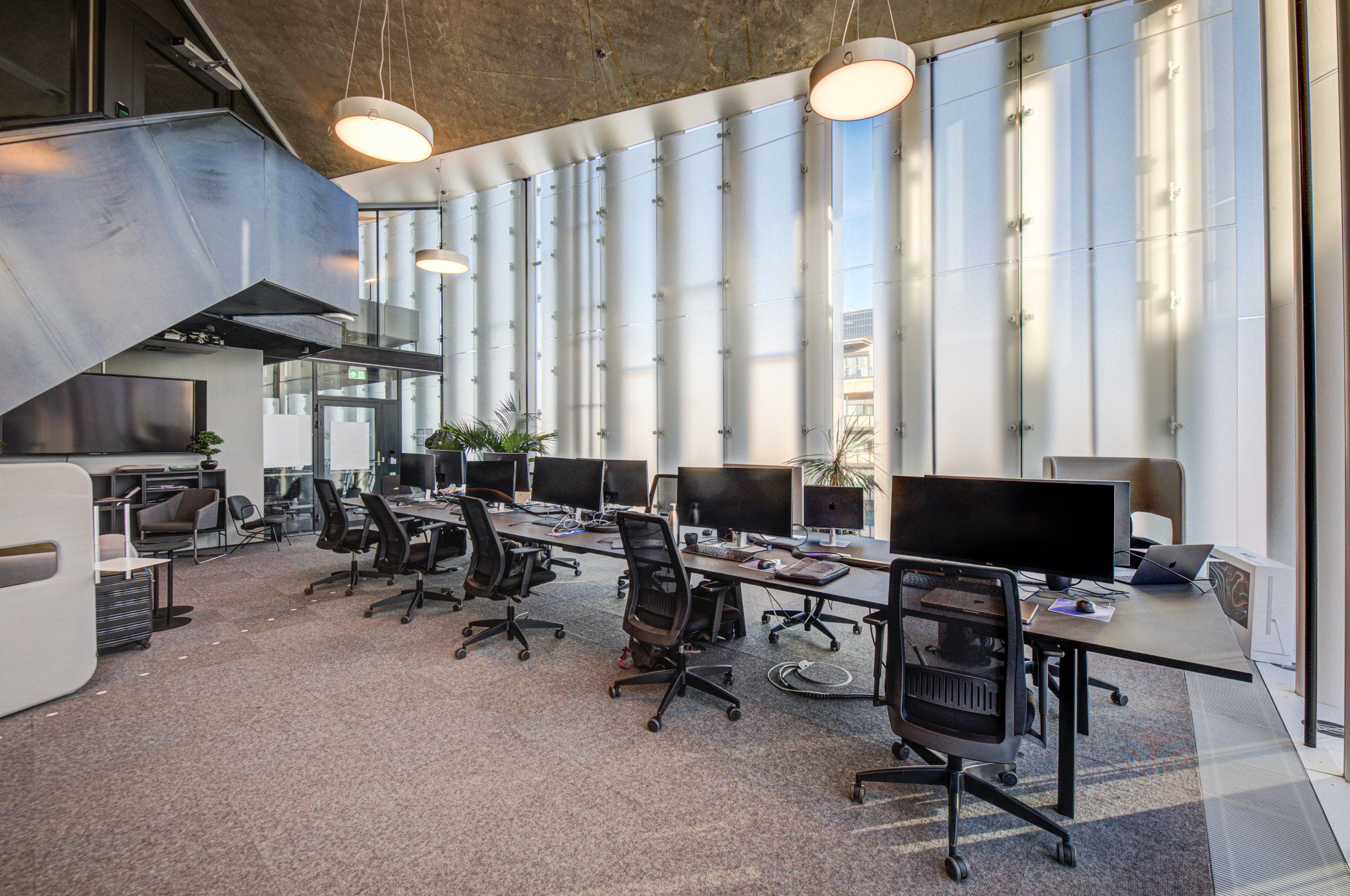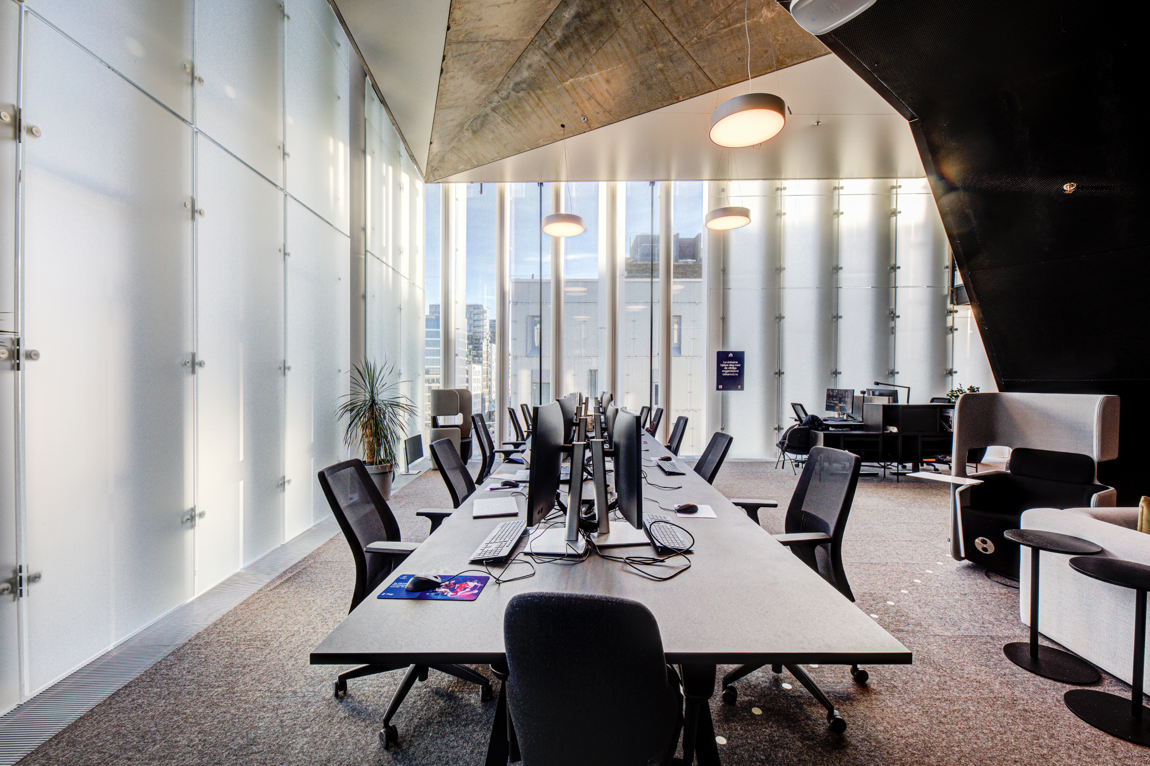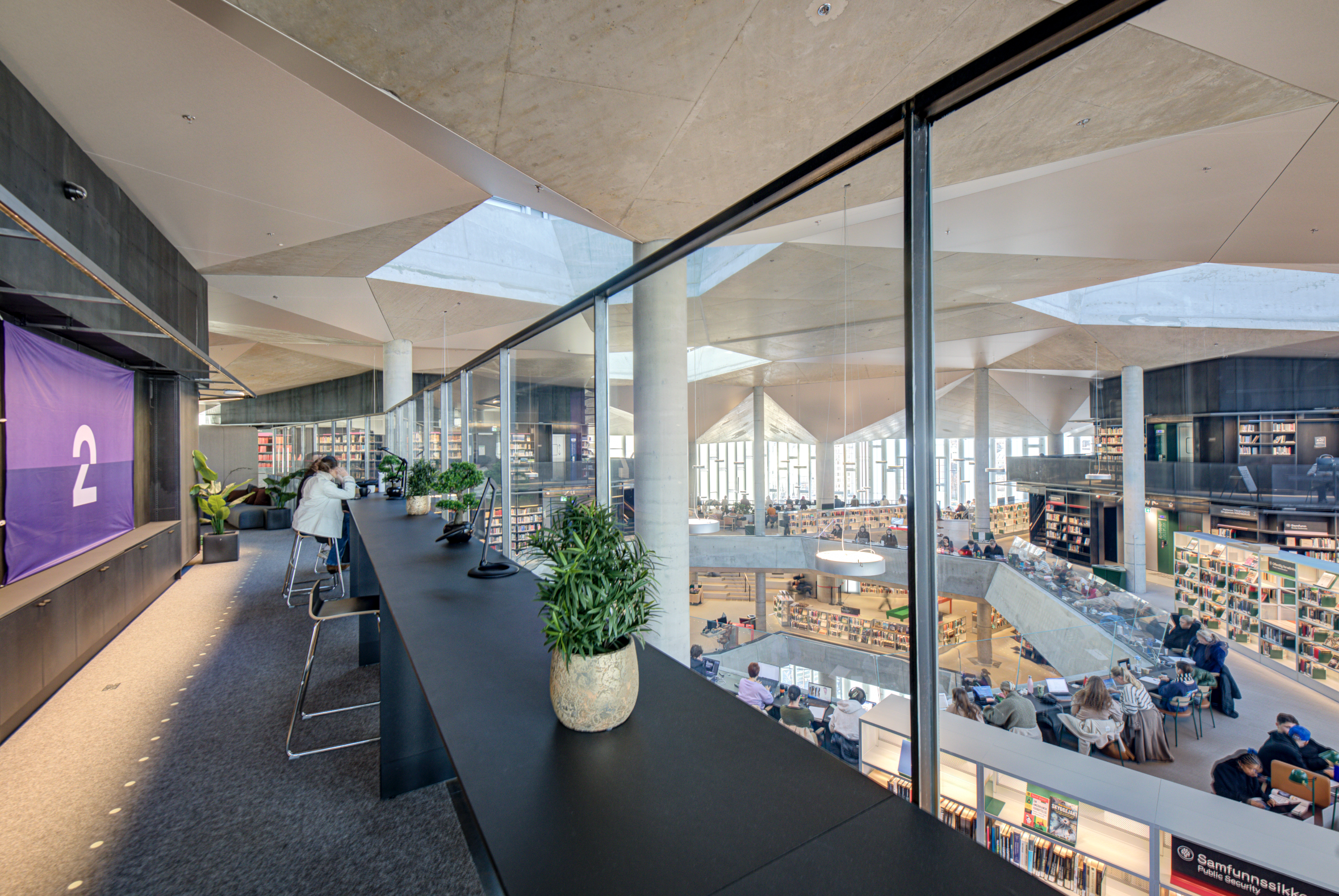 Lokalene strekker seg over to etasjer og kombinerer åpne arbeidsplasser, teamområder og møterom. Her jobber du både skjermet og tett på byens yrende liv. Noen deler av lokalene vender ut mot Bjørvika, mens andre åpner seg innover i biblioteket med glassvegger og en luftig, åpen løsning.