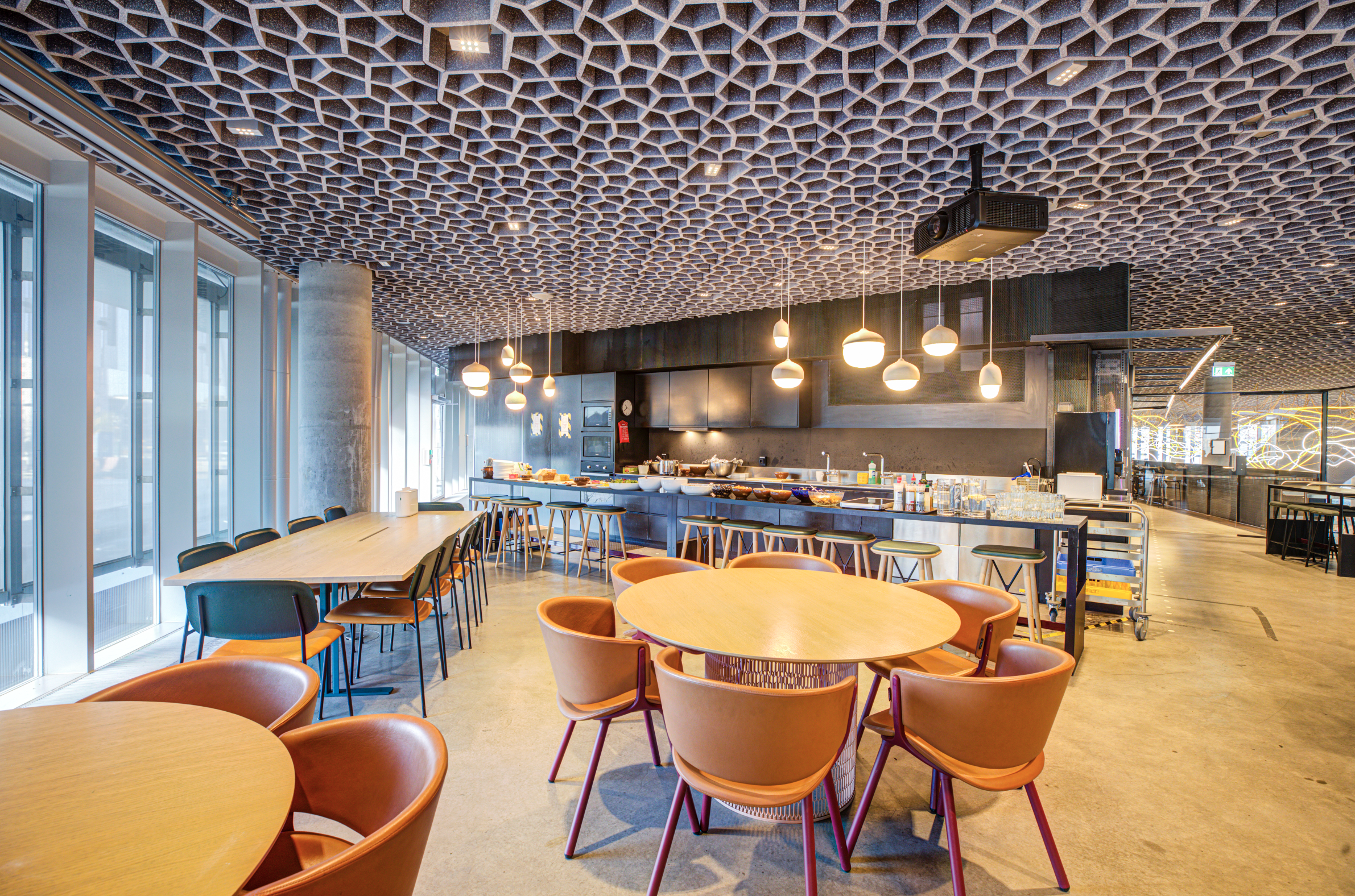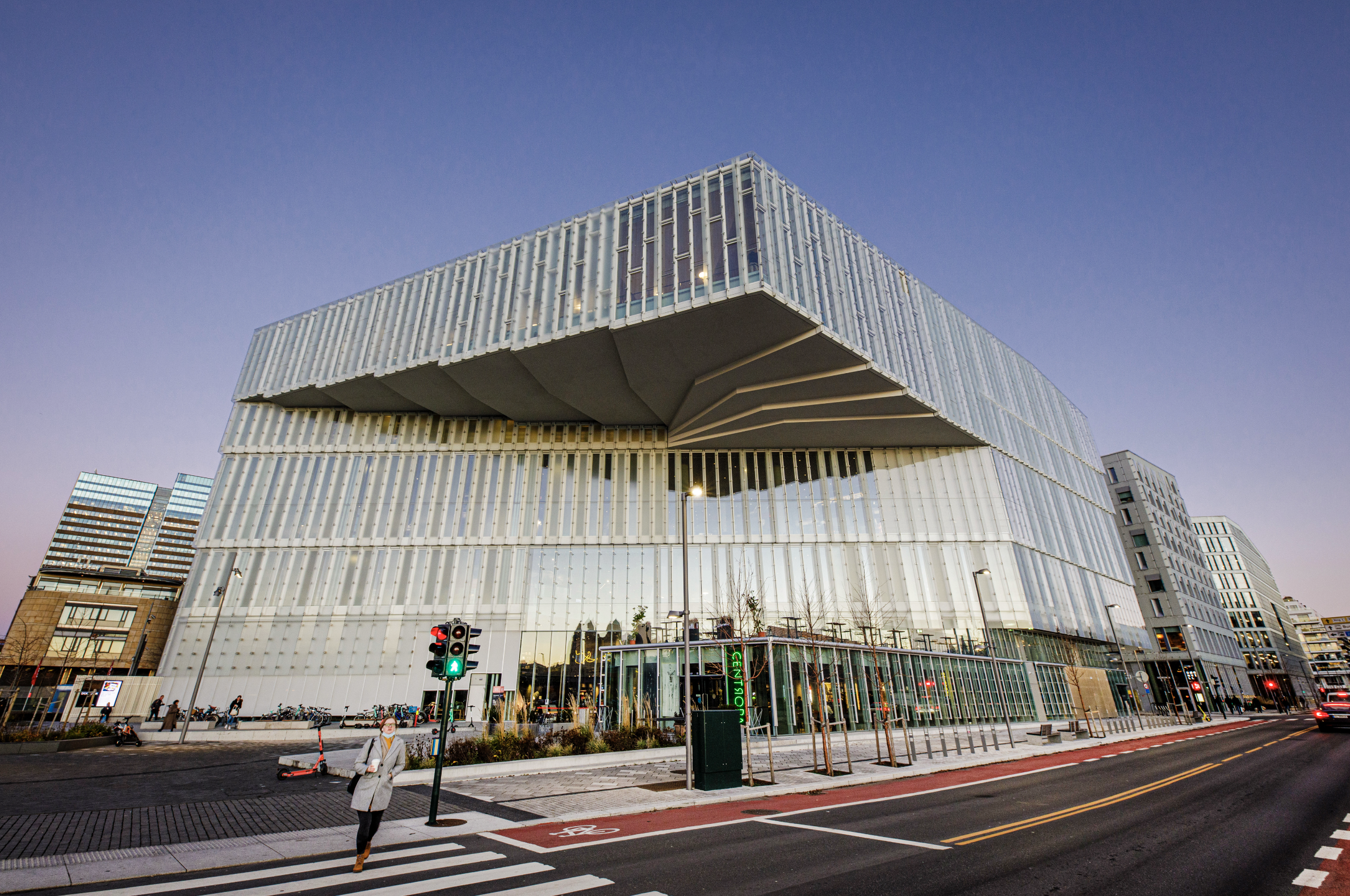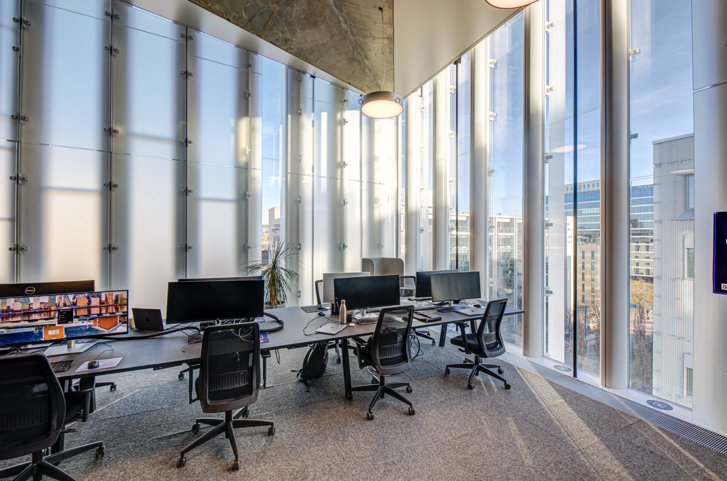 Lokalene strekker seg over to etasjer og kombinerer åpne arbeidsplasser, teamområder og møterom. Her jobber du både skjermet og tett på byens yrende liv. Noen deler av lokalene vender ut mot Bjørvika, mens andre åpner seg innover i biblioteket med glassvegger og en luftig, åpen løsning.
