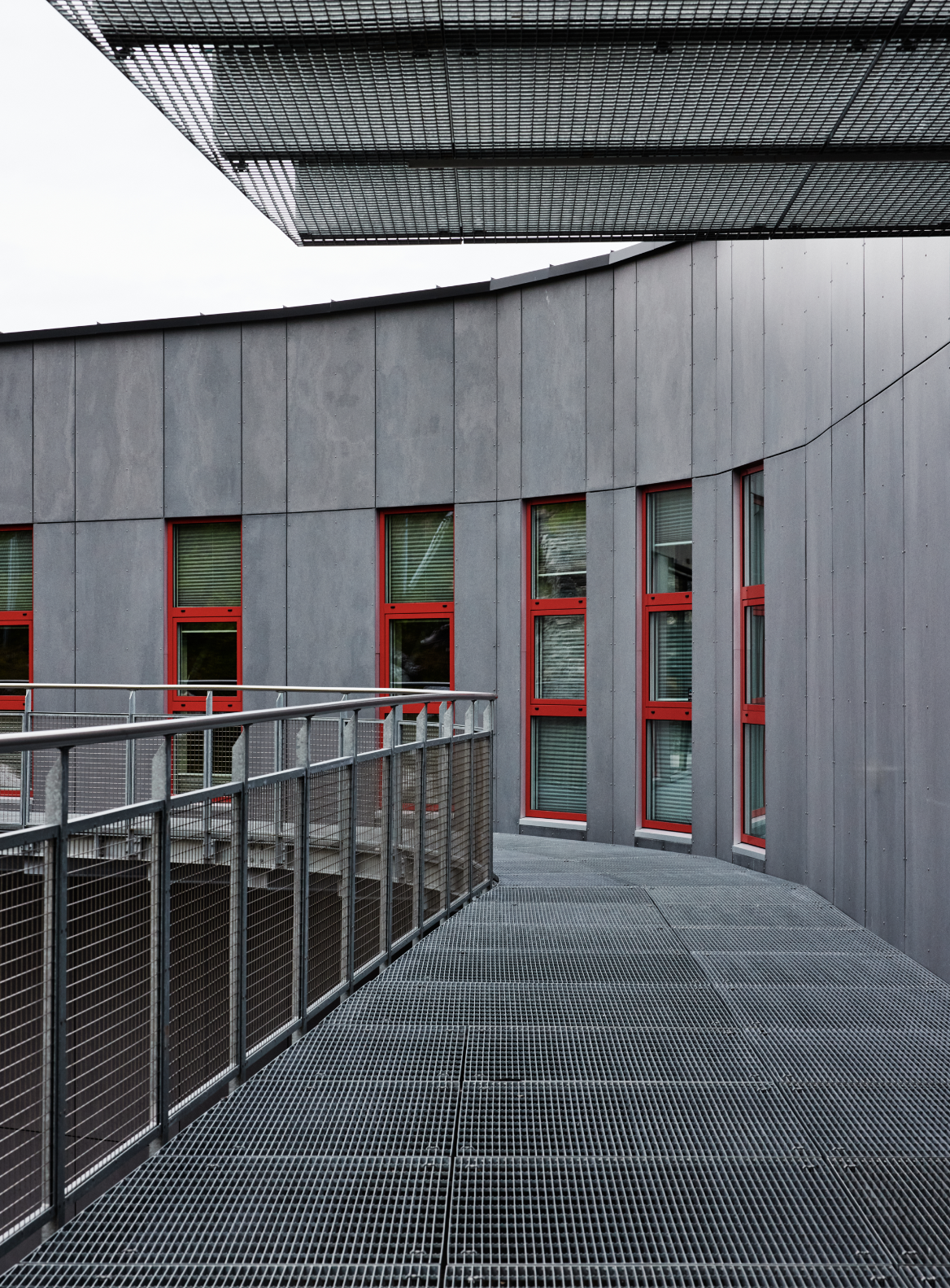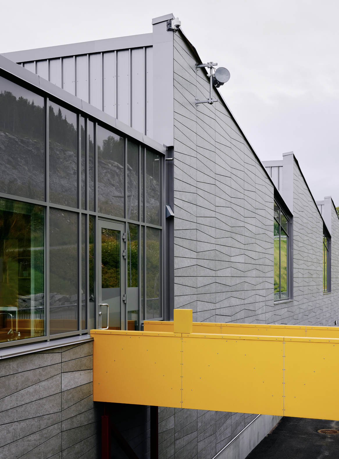 Byggets tak ligger på nivå med veien ovenfor og er godt synlig fra terrenget. På baksiden strekker en gallerigang seg langs hele bygget og gir tilgang til de ulike delene av etasjen, samtidig som den visuelt forankrer bygget til fjellveggen. Fasaden er her kledd i antrasittfarget fibersement, brutt opp av markante vindusrammer i rødt.