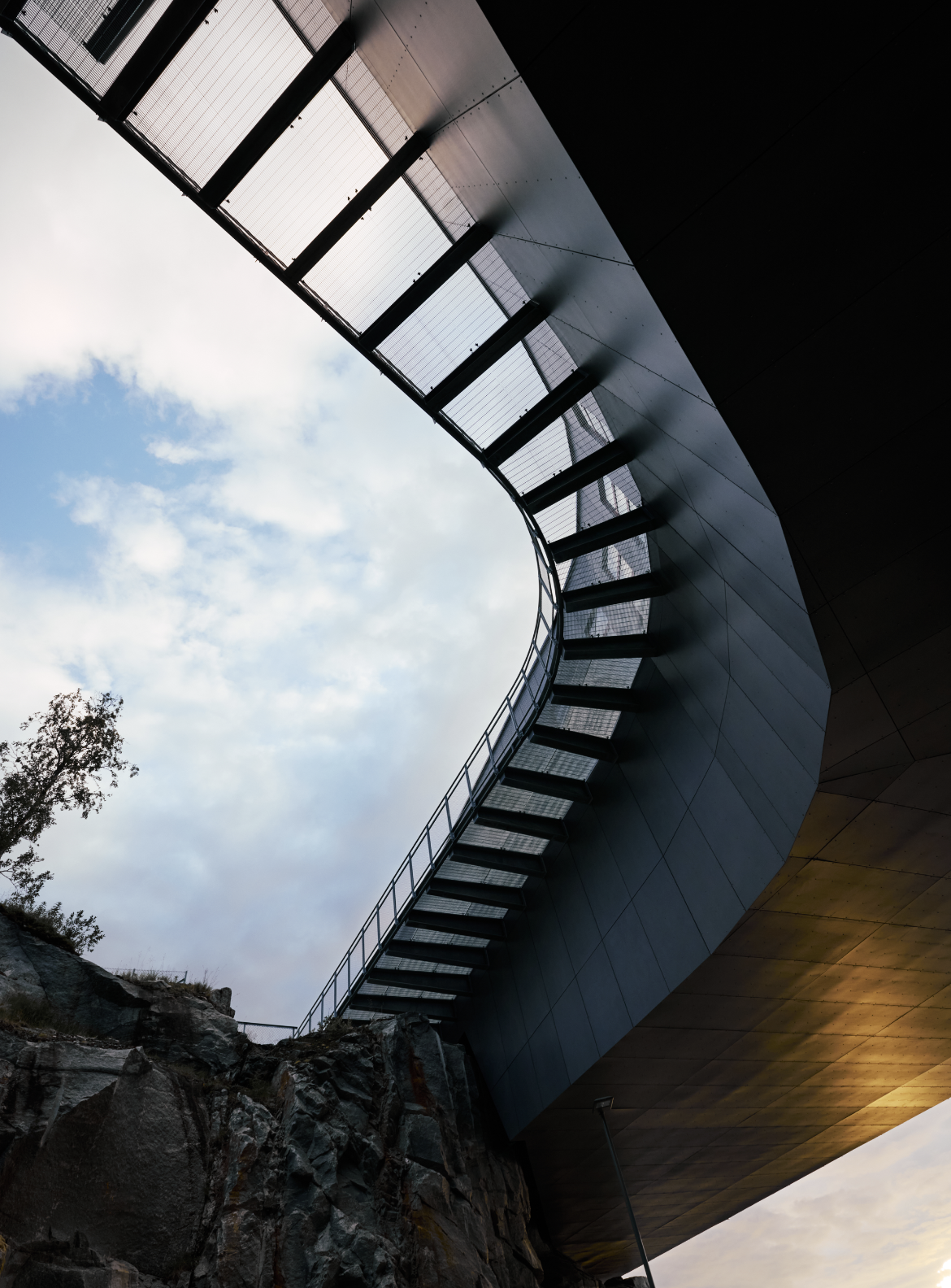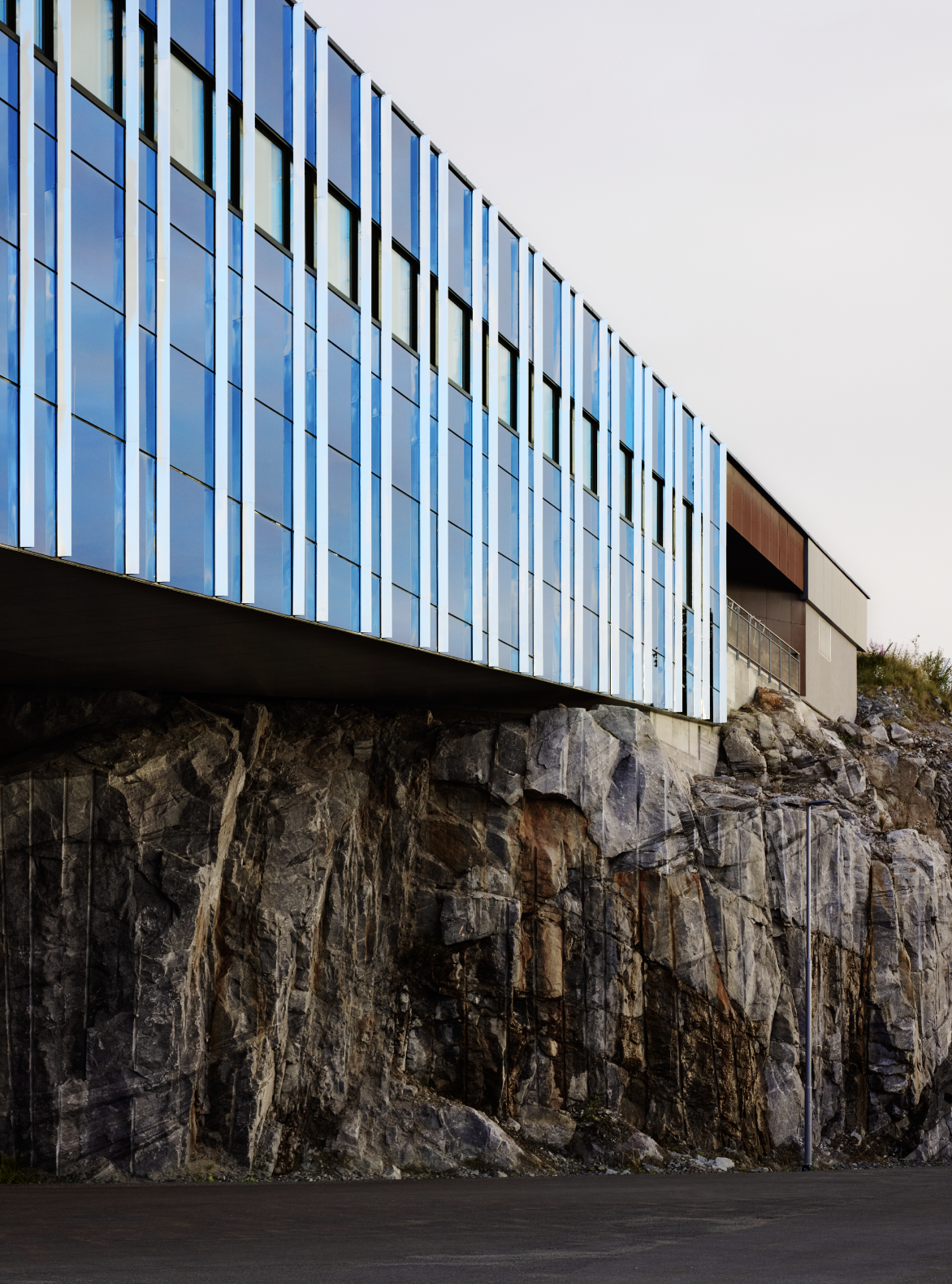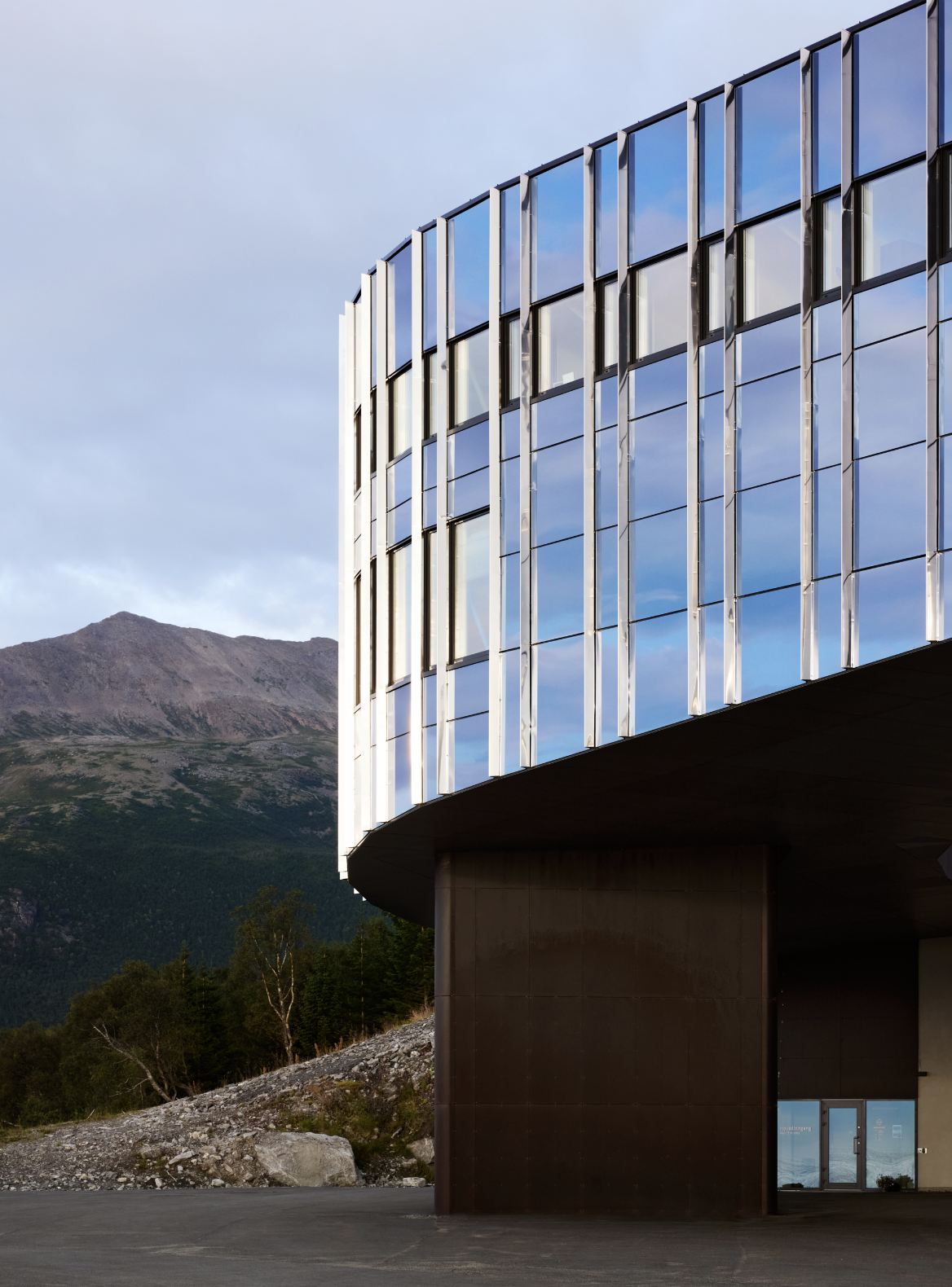 Den konvekse fasaden vendt mot havet er kledd i svart glass, delt opp av lameller i rustfritt stål. De vertikale elementene stikker diskret ut, forsterker refleksjonsevnen og tilfører dybde. Dermed speiler fasaden landskapet rundt og skaper et fargespill som endrer seg med lys, vær og årstid.