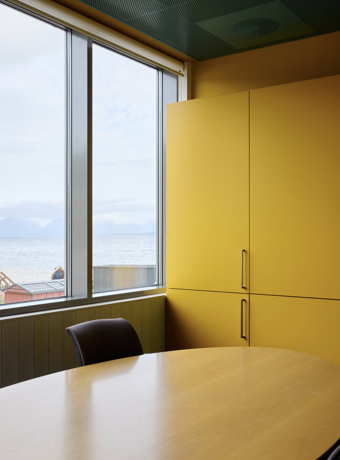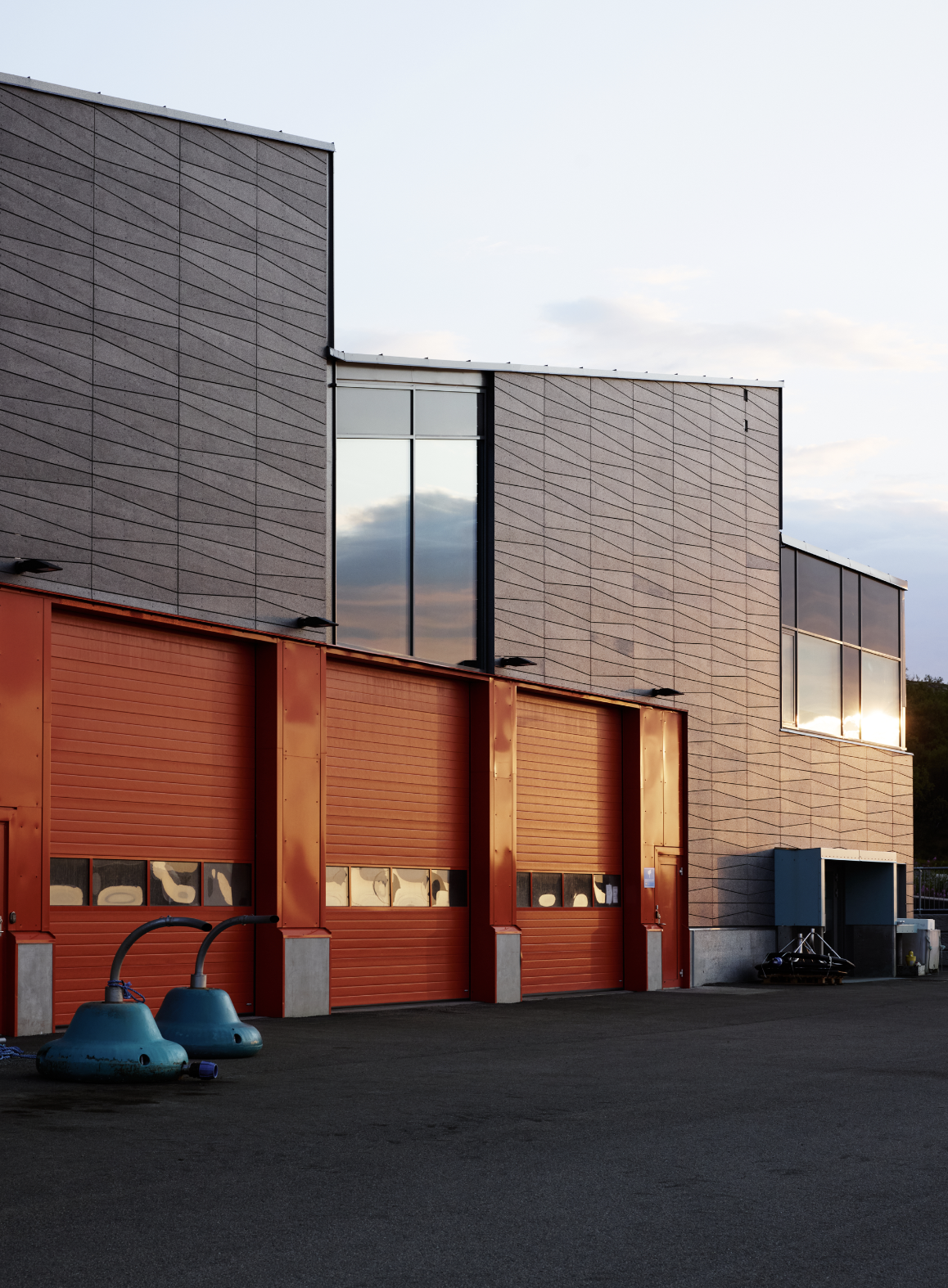 På kaia ligger også et lager- og kontorbygg, kledd med tynne fibersementplater. Innvendig gir resirkulerte plasttepper vevd for å ligne fiskegarn både slitestyrke og taktilitet. Industridelene er utført i en dyp rødtone som harmonerer med det brannhemmende belegget, mens blått og gult fra utstyr på lager gjenspeiles i interiøret og skaper kontrast.