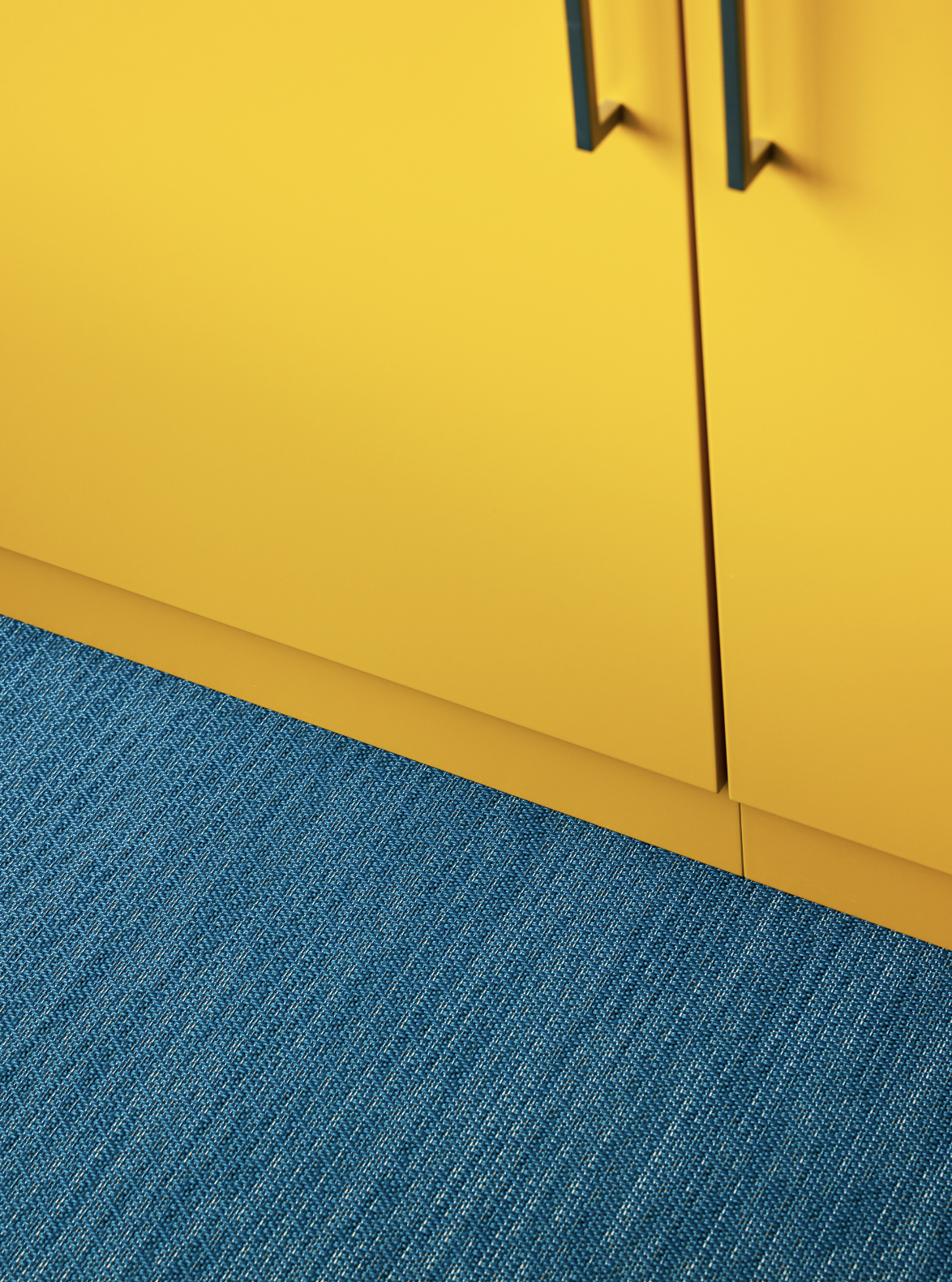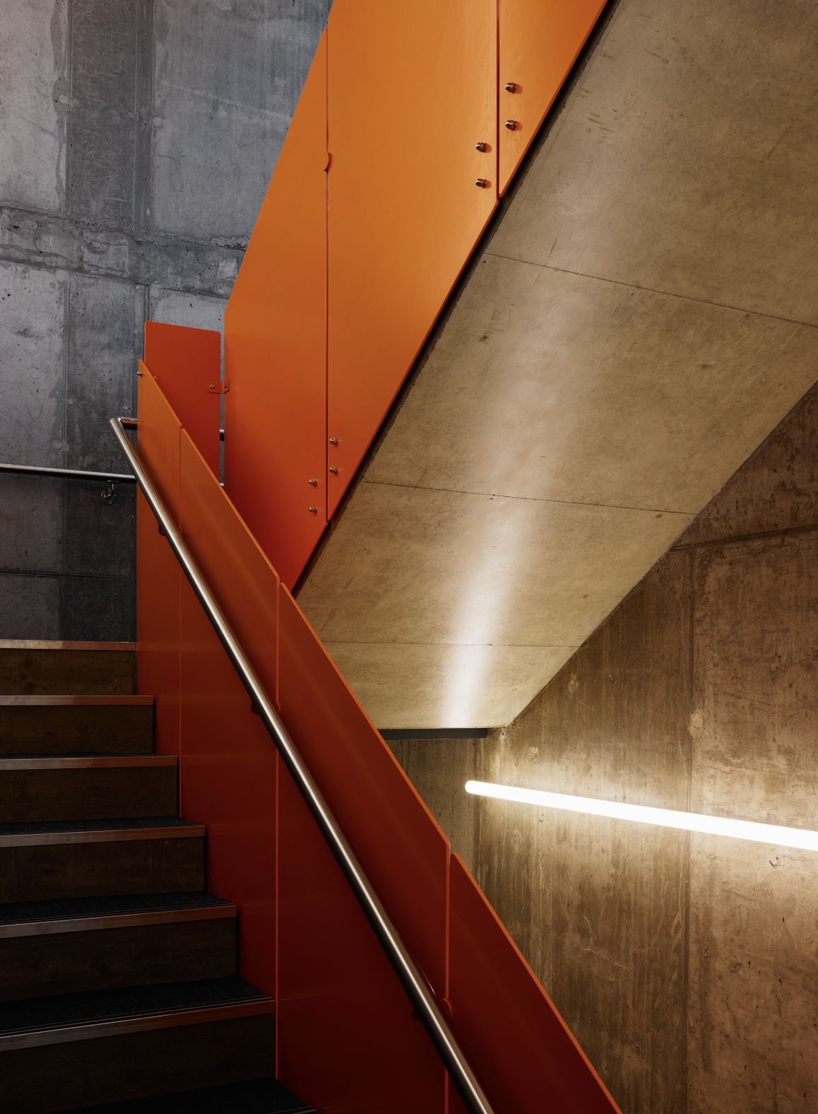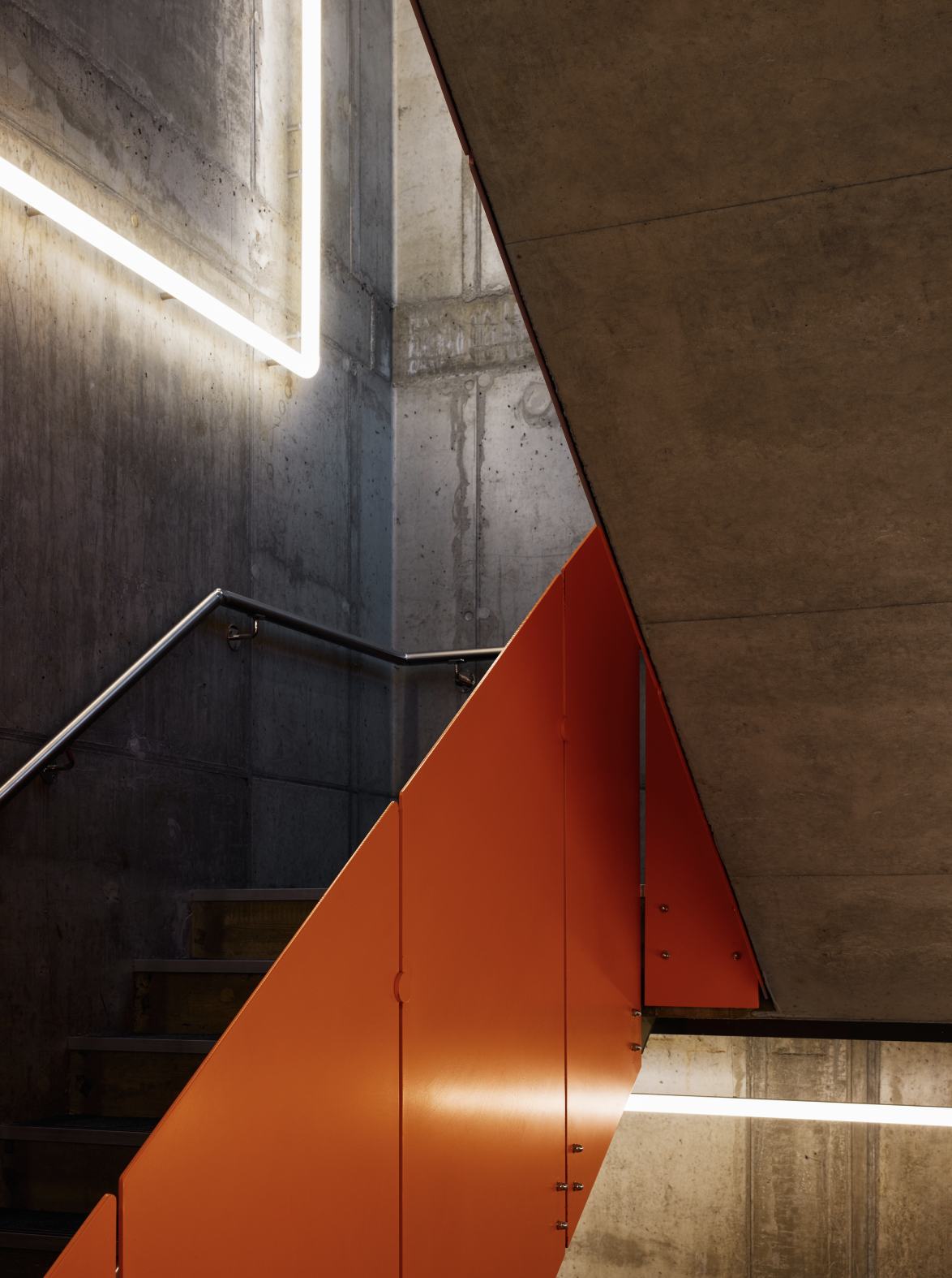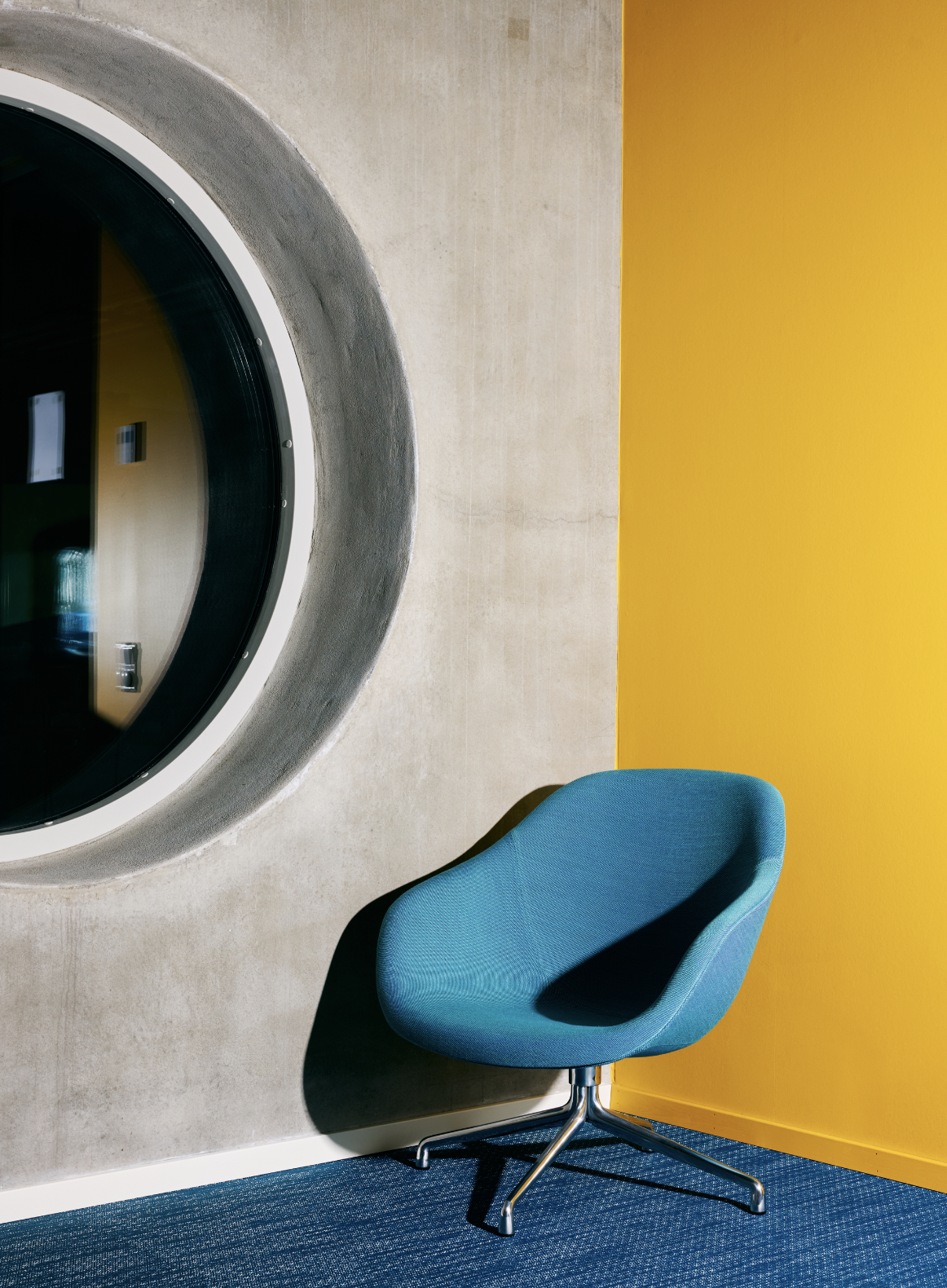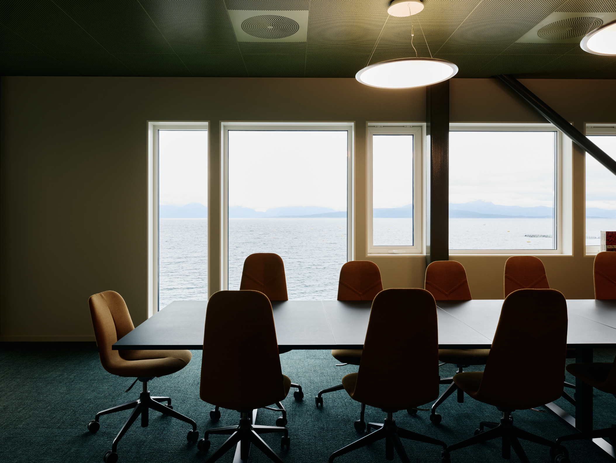 Innvendig gir en trappekjerne i rå betong en industriell karakter, mens en lysinstallasjon tilfører en skulpturell dimensjon. Gulvene er belagt med tepper laget av resirkulerte fiskegarn – en hyllest til selskapets maritime røtter og et uttrykk for bærekraft. En rød-oransje palett binder helheten sammen, inspirert av bøyene i havet rundt.