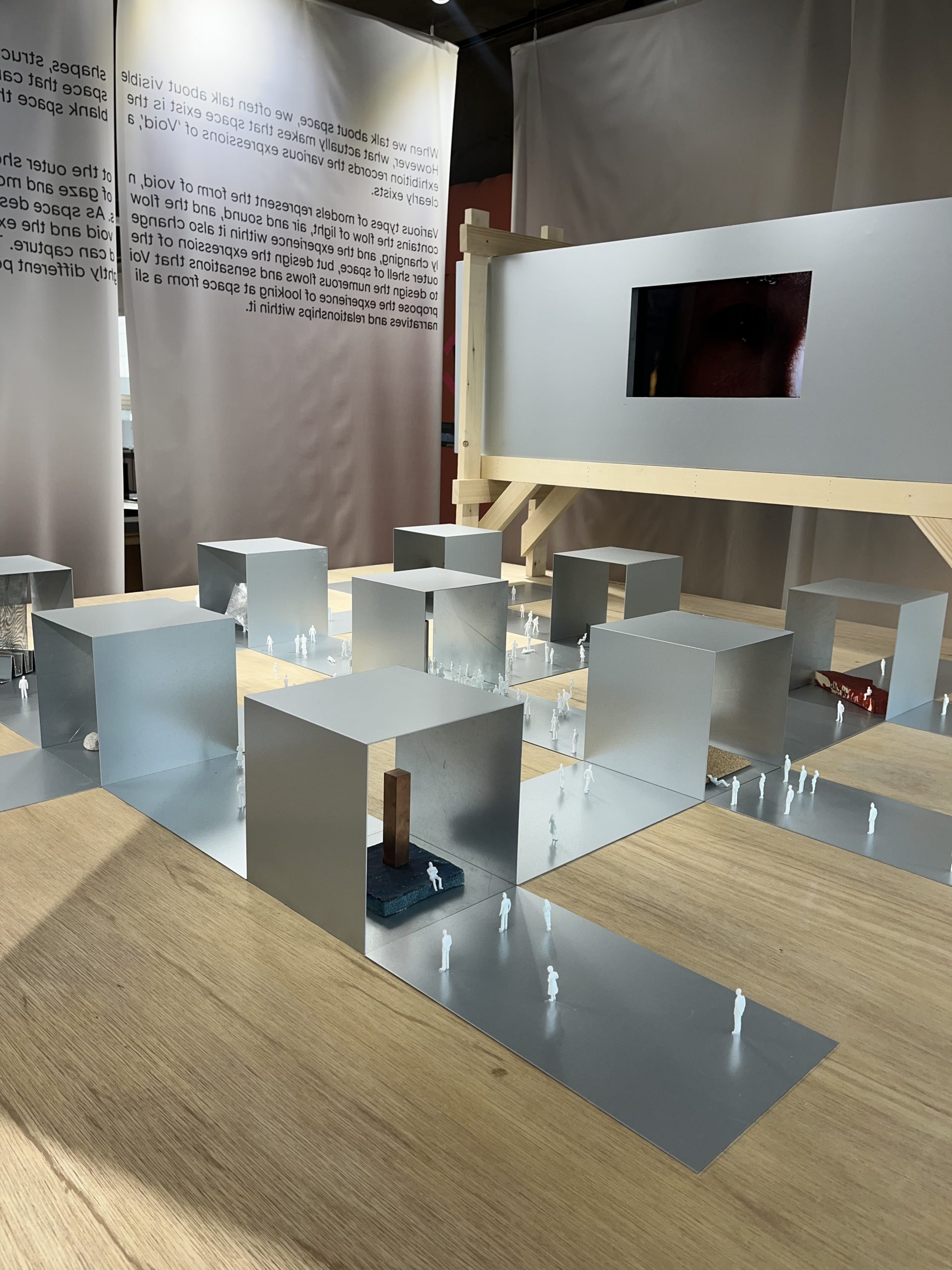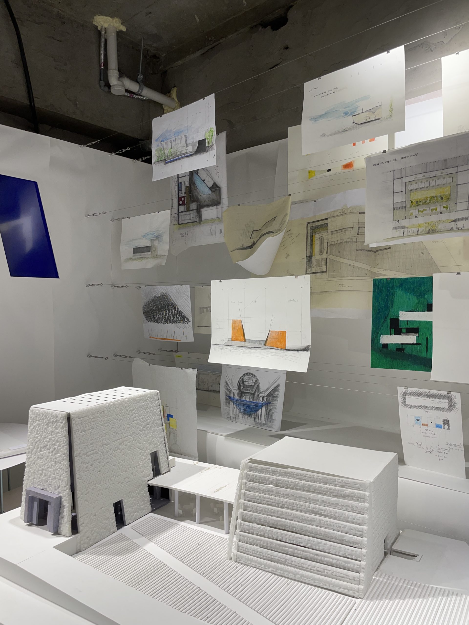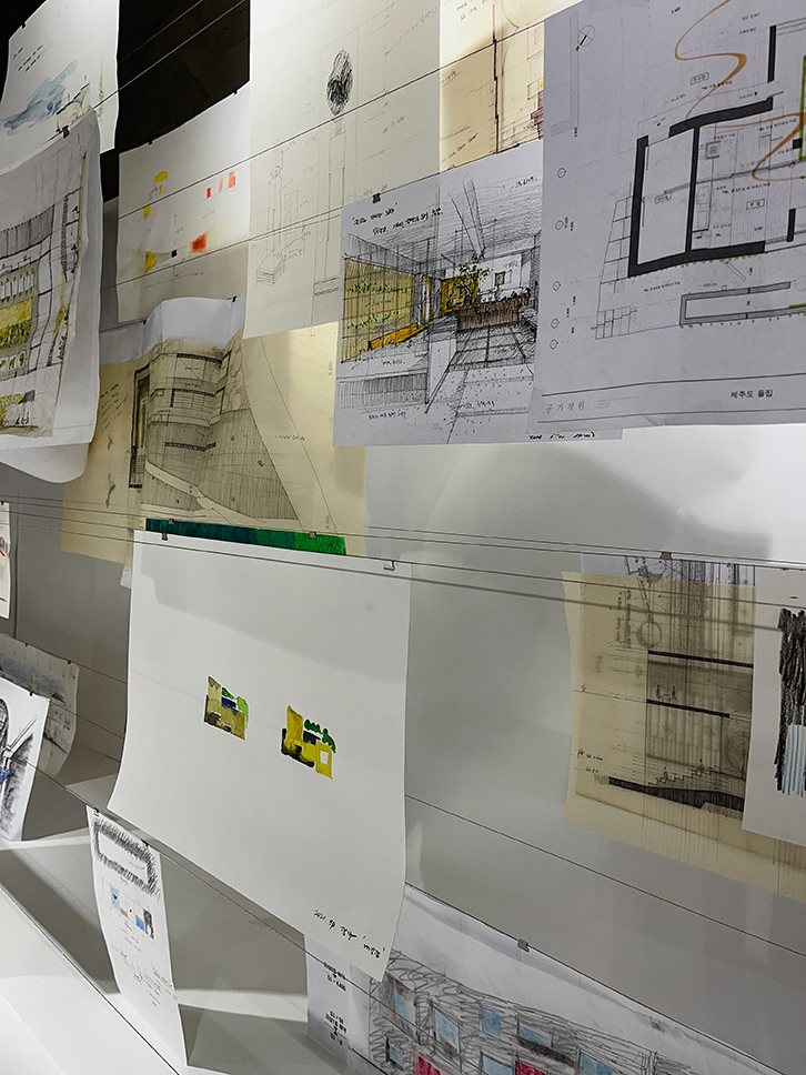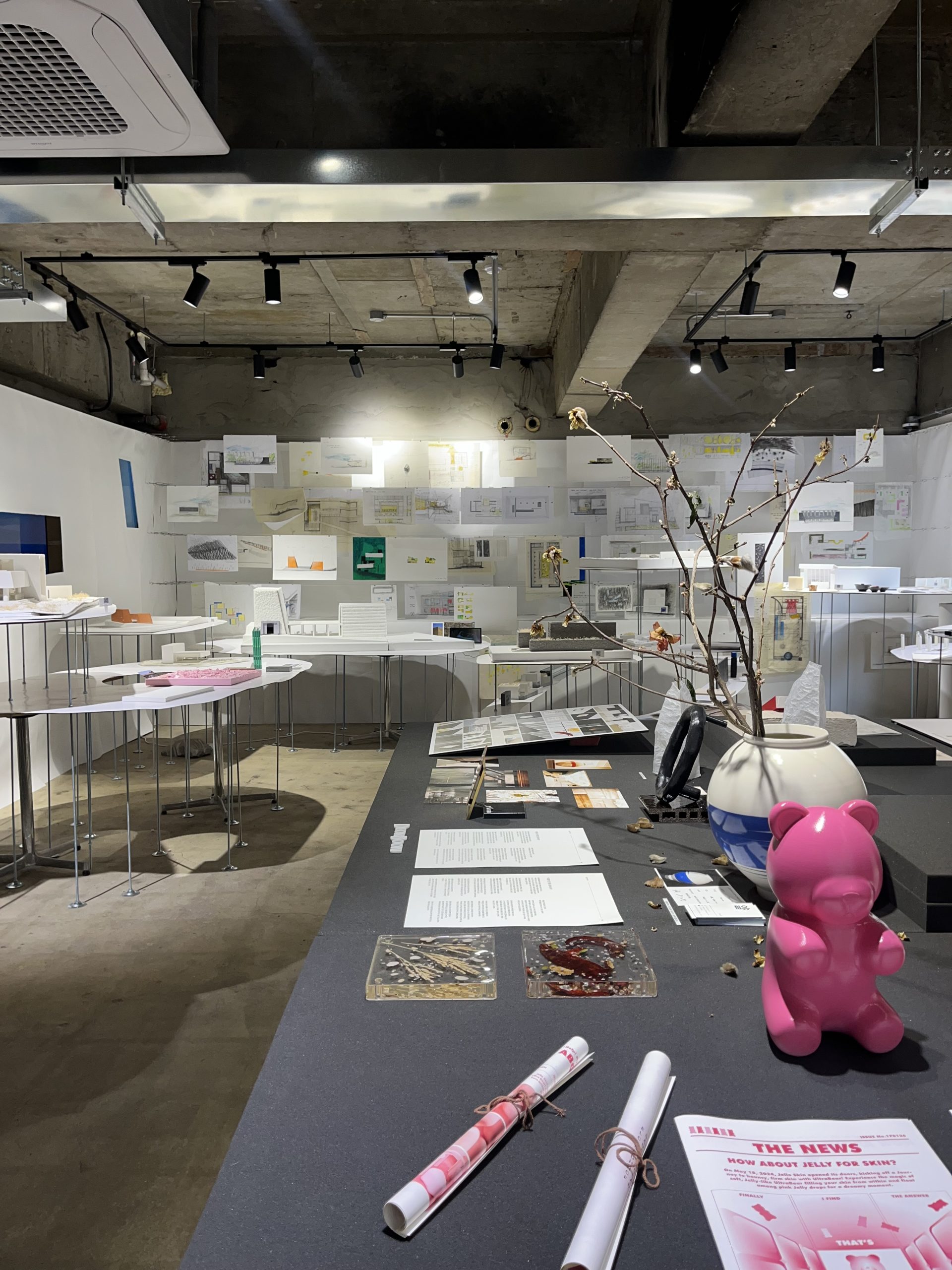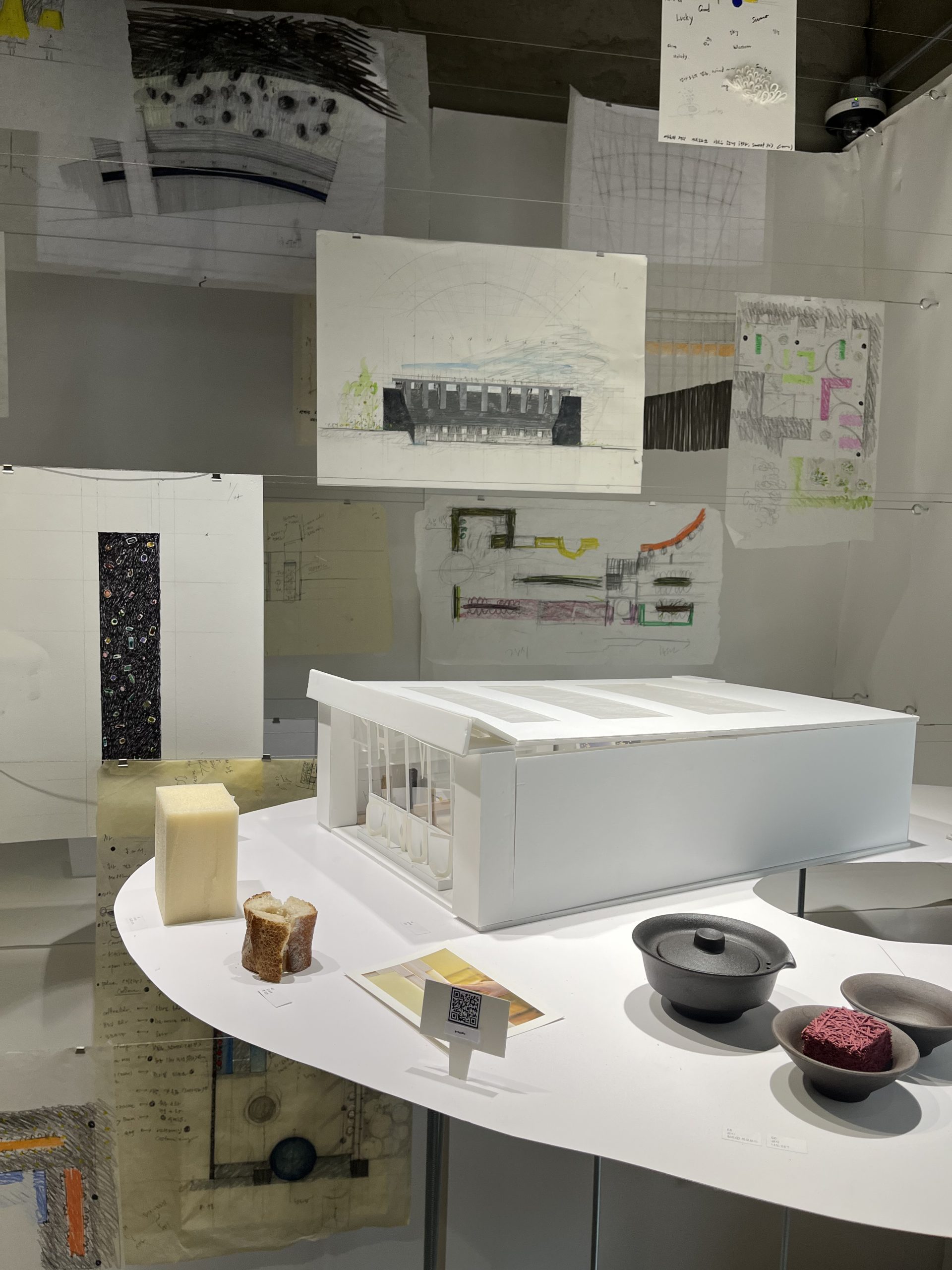 I bibliotekets temporære galleri var det en utstilling som inneholdt skisser og idéutkast til fysiske modeller. I tillegg fikk vi vite at det jevnlig arrangeres kunstutstillinger med ulike temaer, som gir en plattform for kunstnere og designere. På denne måten skaper biblioteket et levende, tverrfaglig og innovativt rom som åpner opp for møter mellom profesjonelle, studenter og publikum.
